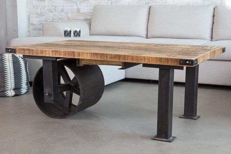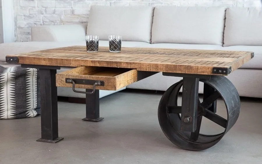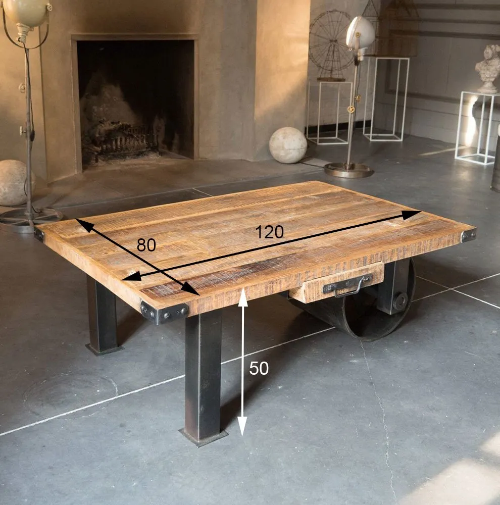 Version miniaturisée de la table à roue géante, cette table basse industrielle est ce qu’il se fait de mieux en terme de robustesse grâce à sa structure de métal et son plateau en manguier massif. Avec son concept original, elle ne manquera pas d’attirer les questions et convoitises de vos invités. Apportant une touche vintage et industrielle, cette table est idéale dans un salon où son long tiroir vous permettra de ranger vos diverses télécommandes.