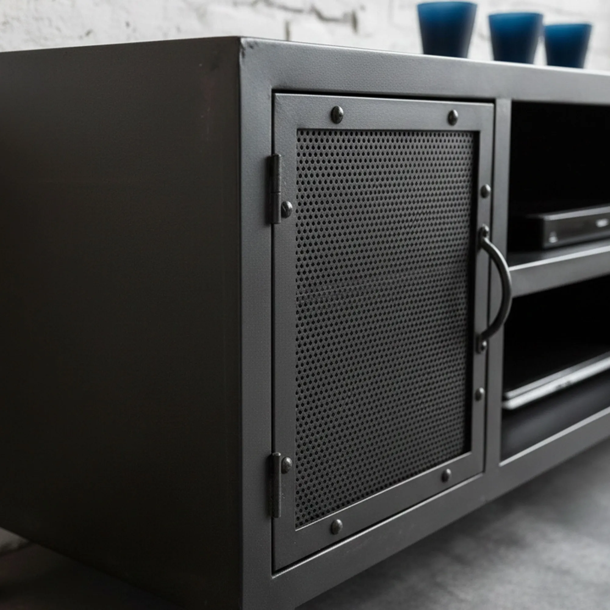 On apprécie particulièrement l’originalité des portes, grillagées et serties de rivets en métal. Elles seront votre allié rangement pour cacher discrètement vos appareils tout en permettant l’utilisation des télécommandes.