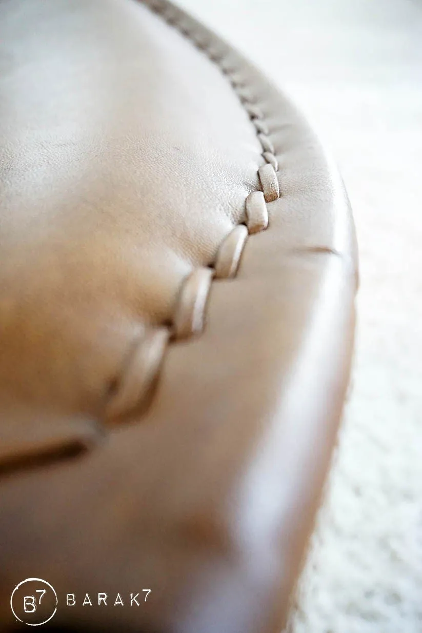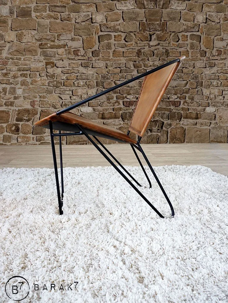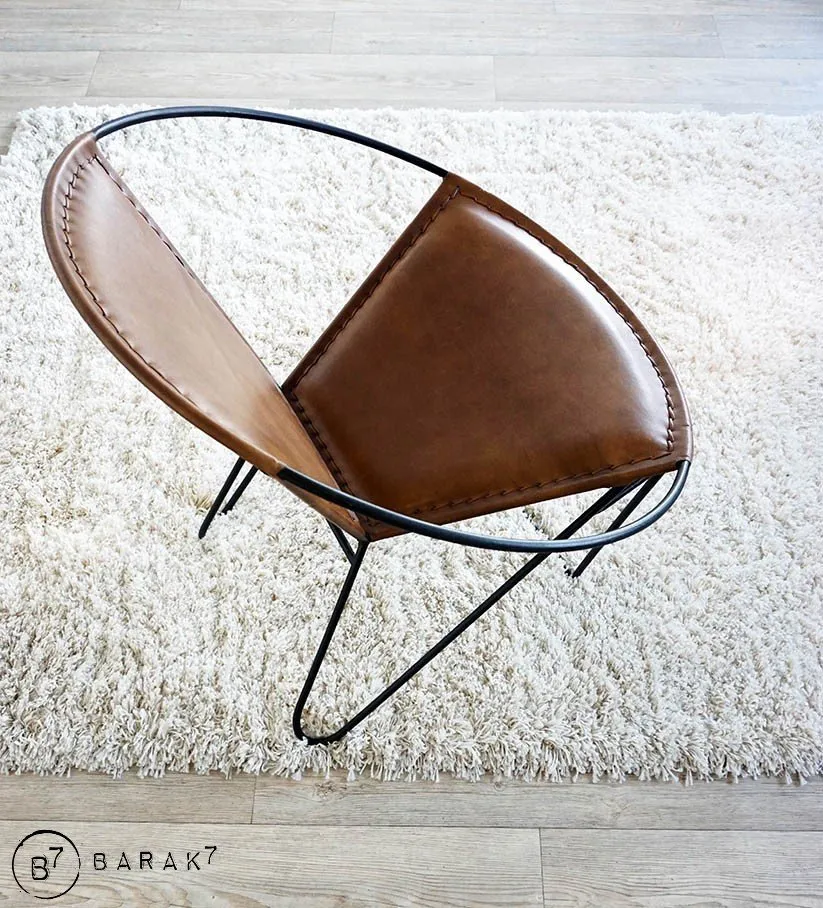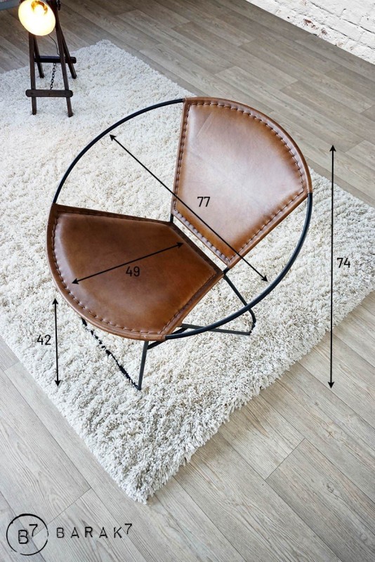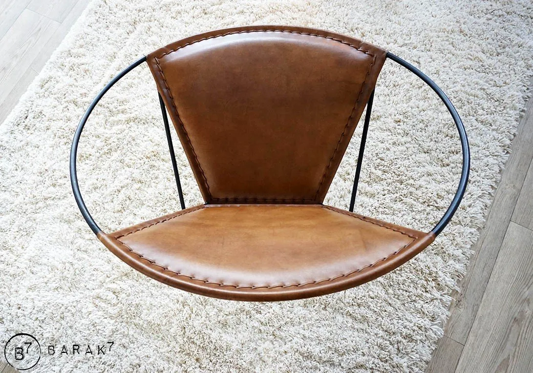Soutenus par un cercle métallique noir, l’assise et le dossier sont fabriqués à partir de ce matériau chaleureux et noble qu’est le cuir de buffle. Les finitions ont été soigneusement réalisées à l’aide de coutures apparentes raffinées.