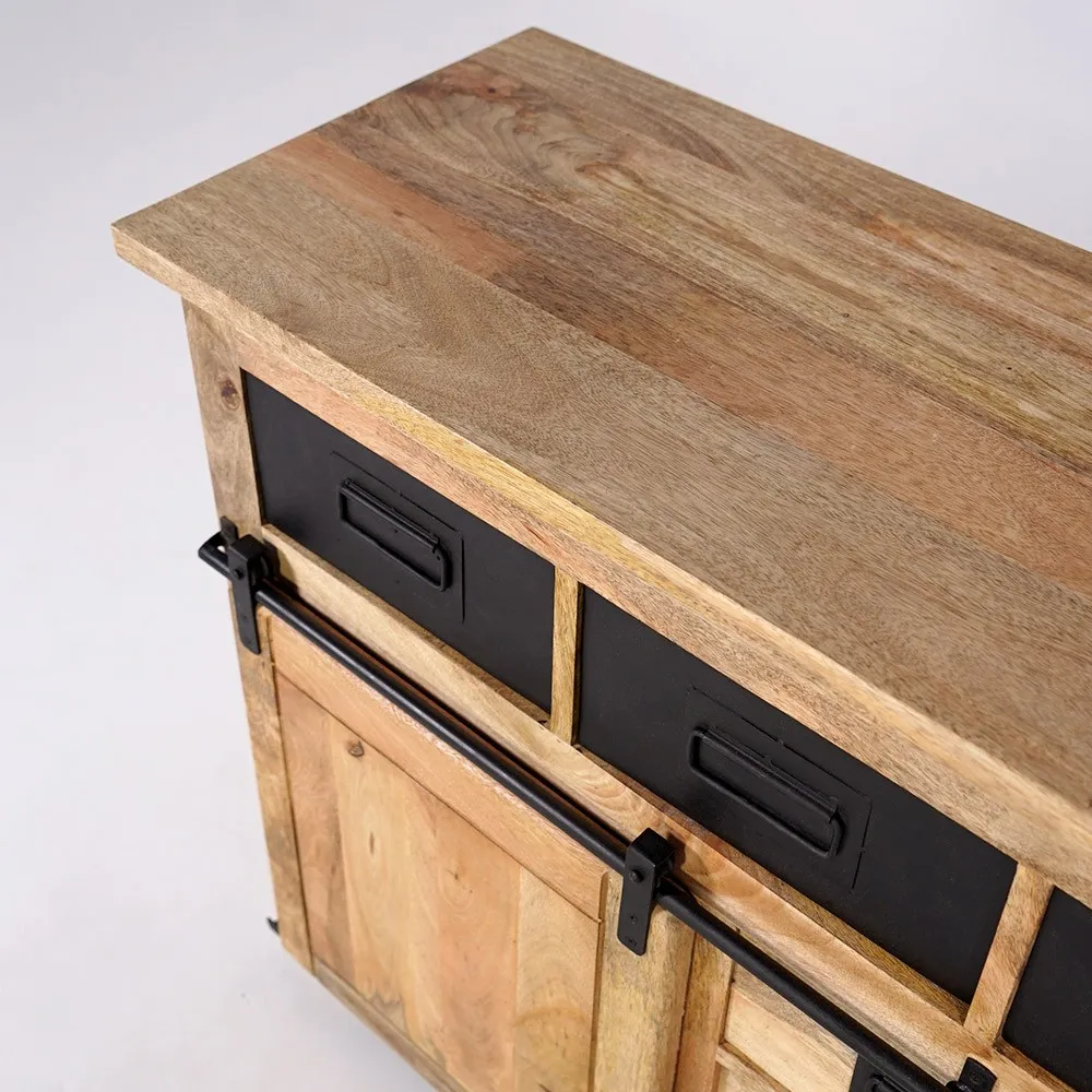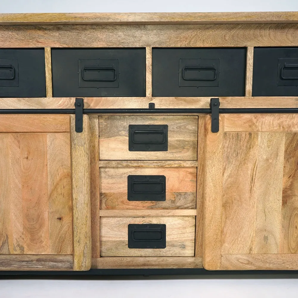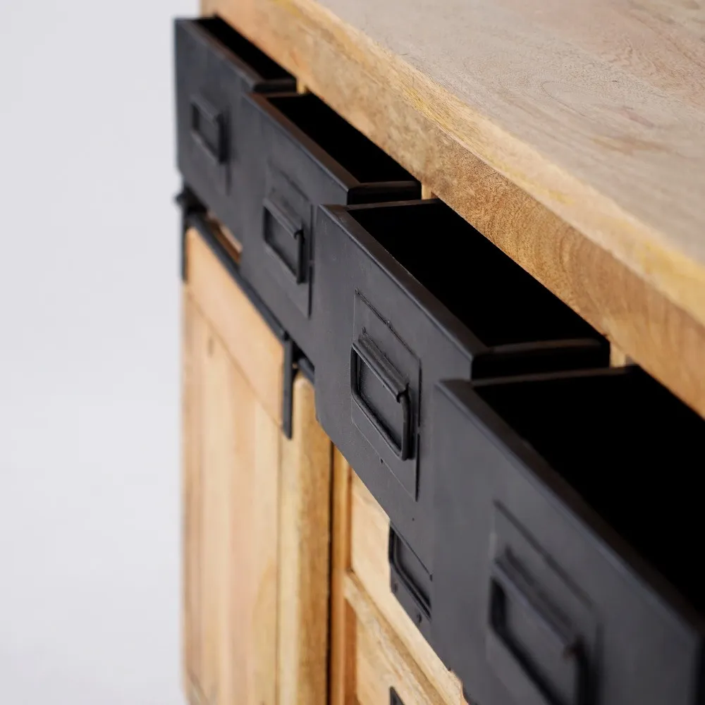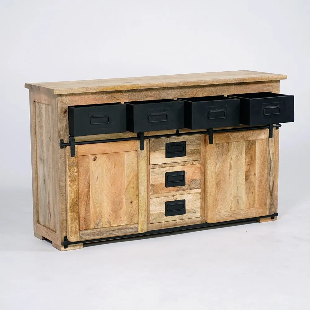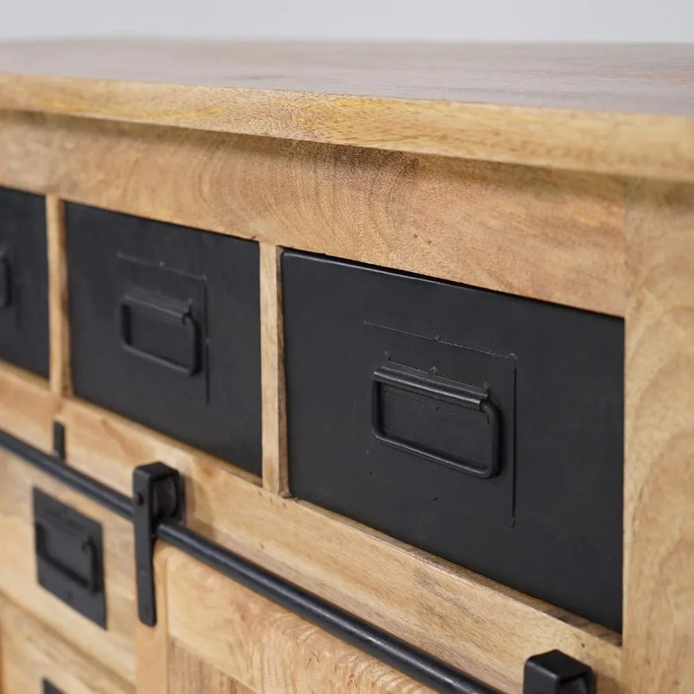 Fabriqué avec soin en bois de manguier massif et en métal de haute qualité, ce buffet incarne l'élégance brute du style industriel. Le bois de manguier massif garantit une durabilité exceptionnelle et une beauté naturelle incomparable, tandis que les accents en métal noir confèrent une touche authentique et contemporaine à l'ensemble.