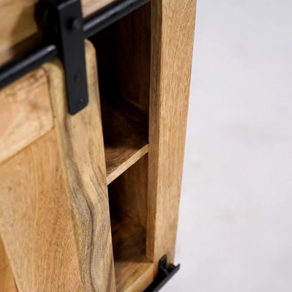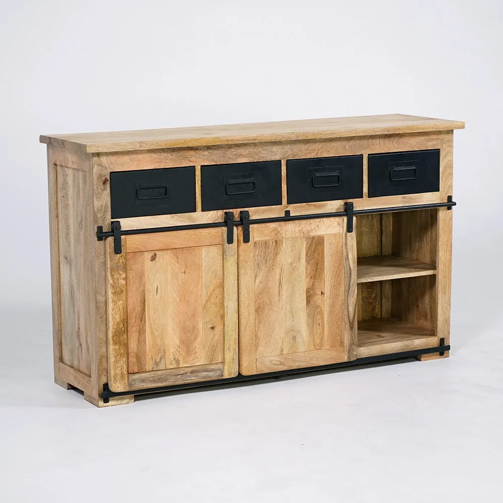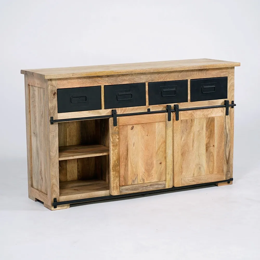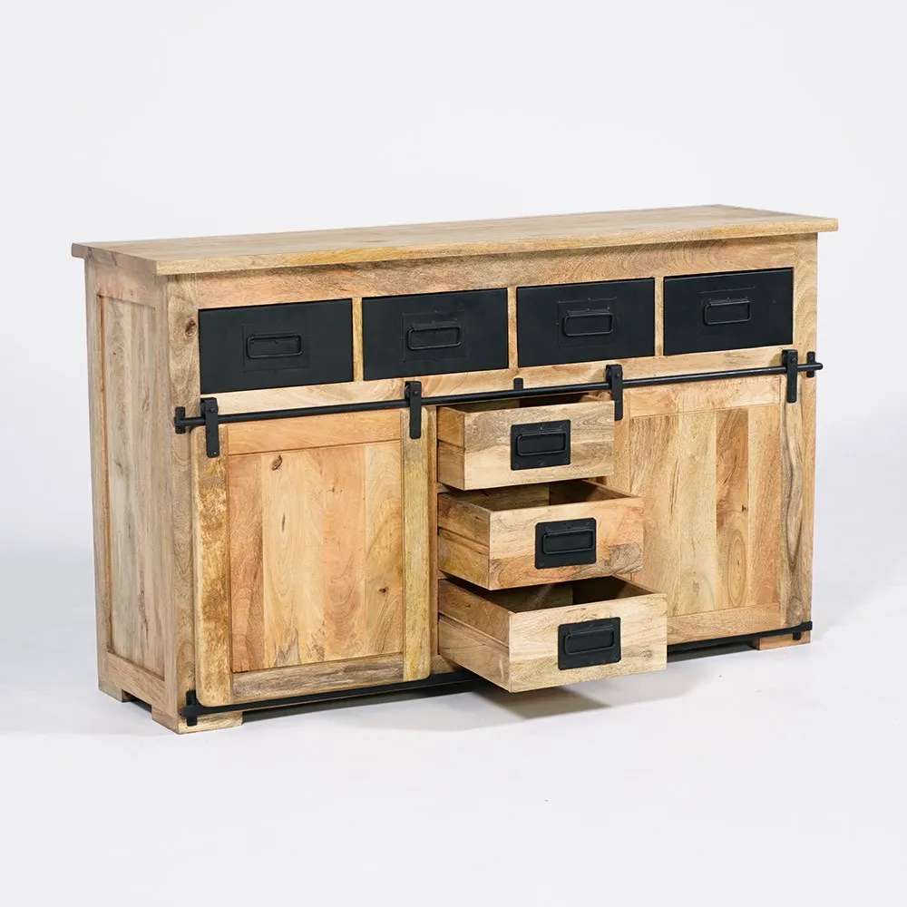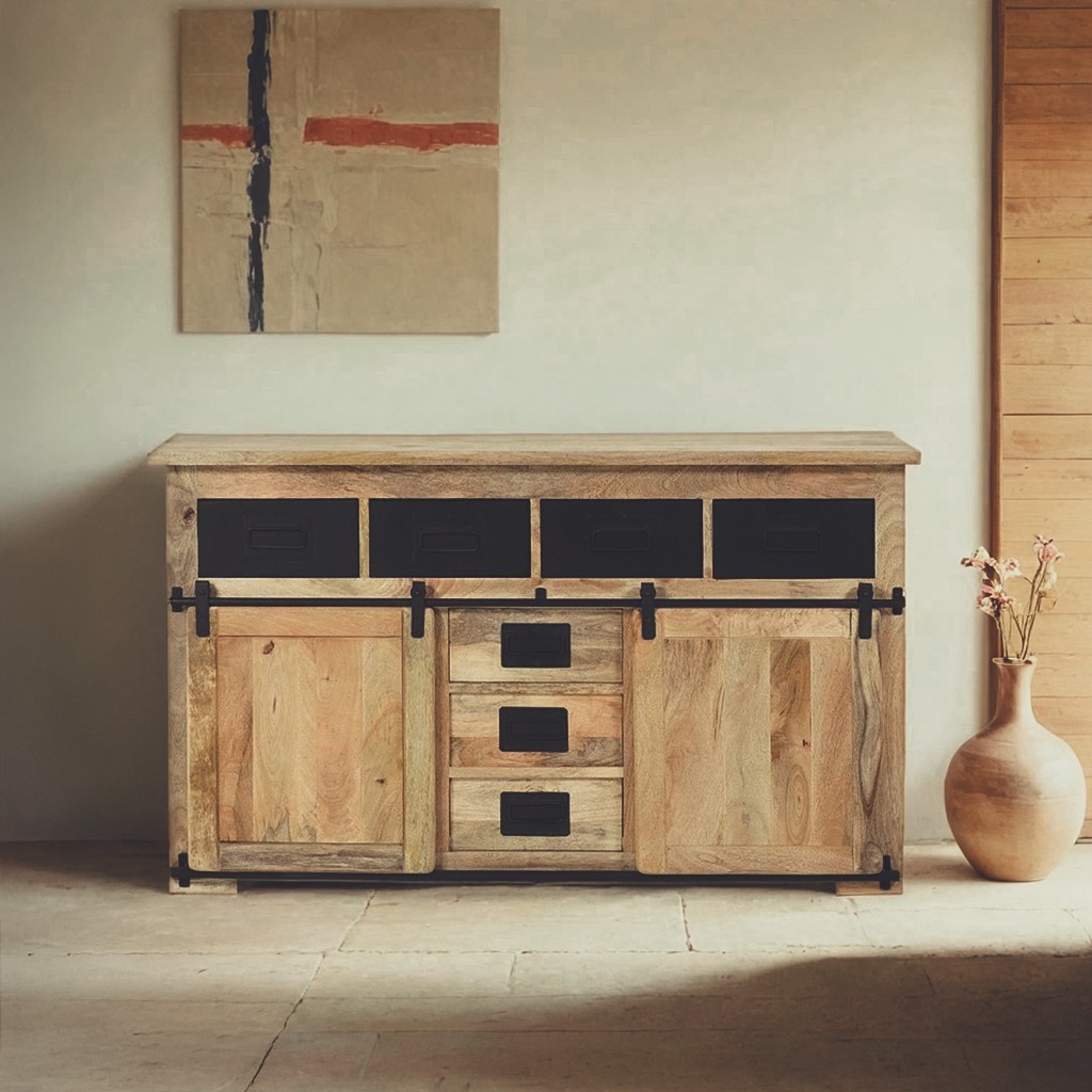 Fabriqué avec soin en bois de manguier massif et en métal de haute qualité, ce buffet incarne l'élégance brute du style industriel. Le bois de manguier massif garantit une durabilité exceptionnelle et une beauté naturelle incomparable, tandis que les accents en métal noir confèrent une touche authentique et contemporaine à l'ensemble.