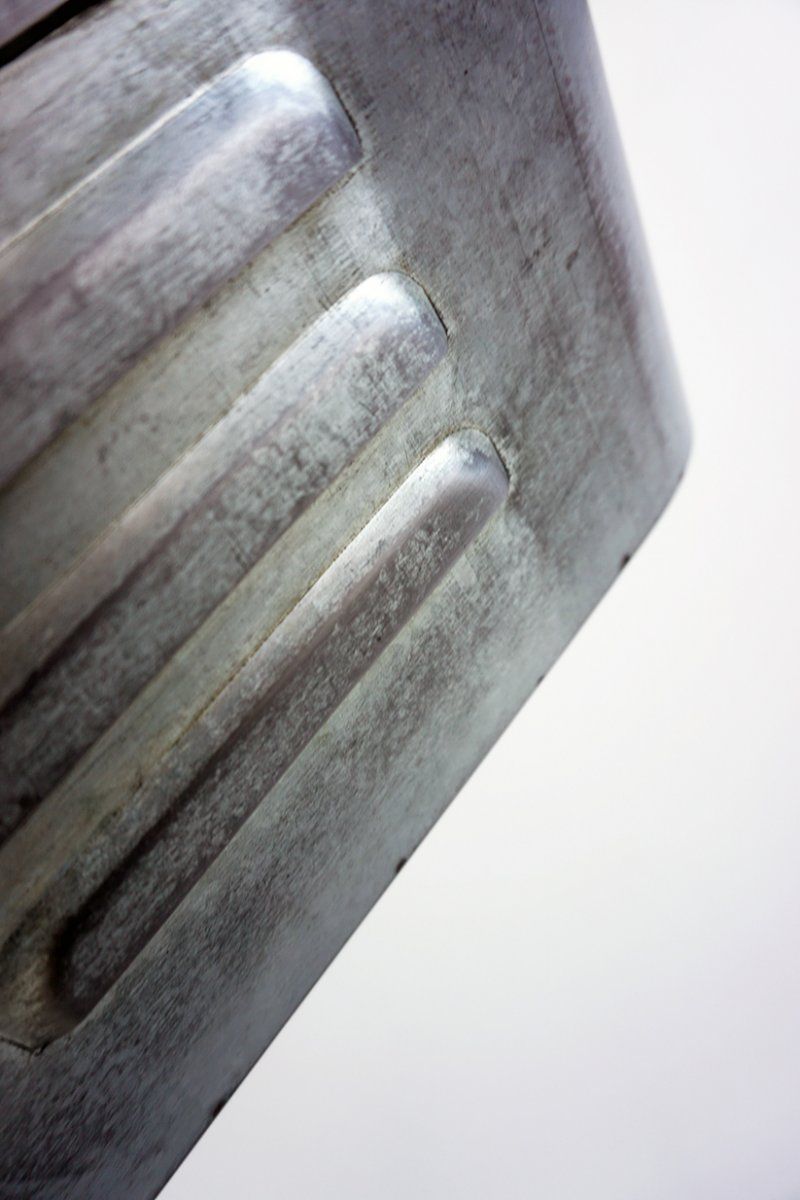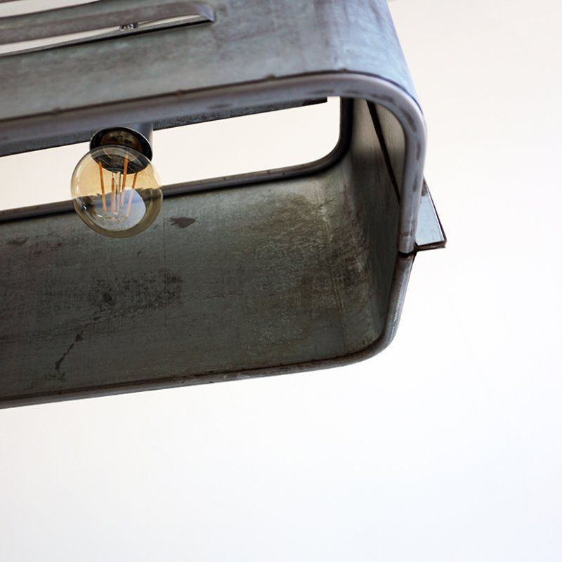 Cette suspension en métal brut est composée de 2 zones d’éclairage cloisonnées dans un caisson industriel de 65 cm de long sur 21cm de large et 21cm de haut.