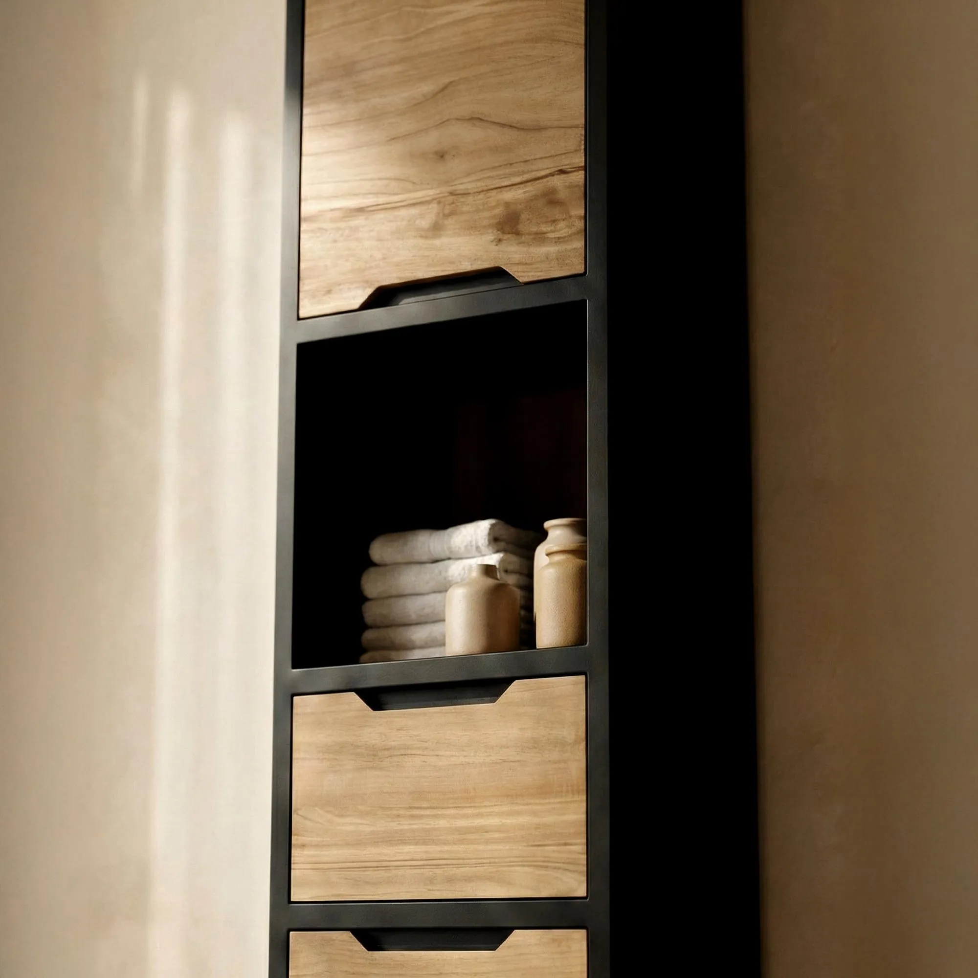 Cette colonne de salle de bain fait partie de la collection Bold. De style industriel, fabriquée en teck massif et métal, elle offre de beaux espaces de rangement pour vos produits de beauté, linge de toilette et autres accessoires de salle de bain. Son look contemporain fera une entrée remarquée dans un intérieur moderne.
