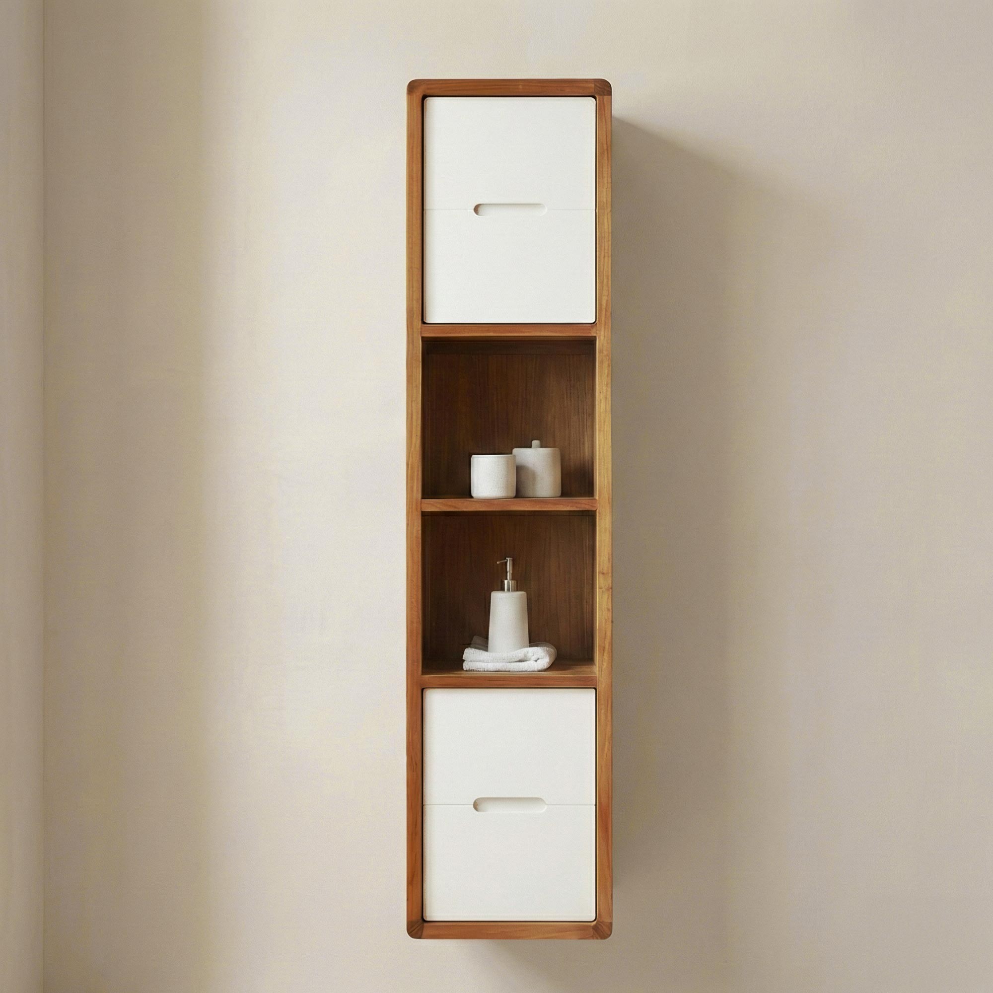 La gamme Duo doit son nom à l’association astucieuse du Teck et du Mindi, deux essences de bois exotique, et au contraste de couleur du bois naturel et du blanc qui apporte de la lumière. Ces meubles à suspendre sont composés d’une structure en bois massif. Les façades des portes et tiroirs sont peintes en blanc et disposent d’une magnifique poignée sculptée de forme ovale. Une ligne horizontale, également taillée dans le bois, vient subtilement offrir à l’ensemble un look moderne. Les matières naturelles et les tons clair sont mis à l’honneur. Un vent de fraîcheur soufflera dans votre salle de bain.