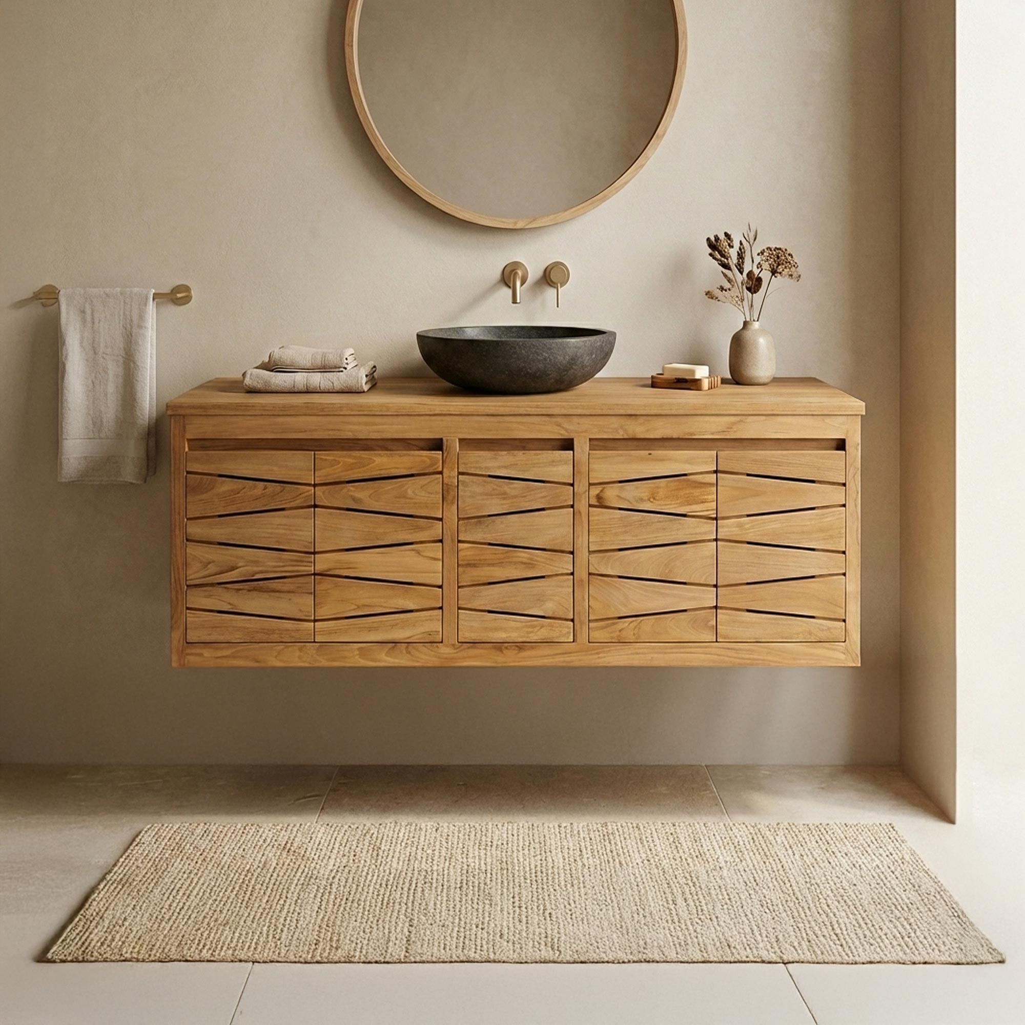 Le teck est le bois le plus adapté aux utilisations en milieu humide en raison de son imperméabilité naturelle. C’est un bois dense, naturellement recouvert d’une oléorésine qui le protège de l’humidité et de l’action de l’eau. Grâce à sa grande résistance aux variations de température, il est très prisé dans l’univers de la salle de bain. Cette essence de bois exotique est le choix haut de gamme par excellence autant pour sa durabilité que pour ses caractéristiques esthétiques : un fini lisse et un grain fin qui prend des reflets dorés au fil des années.