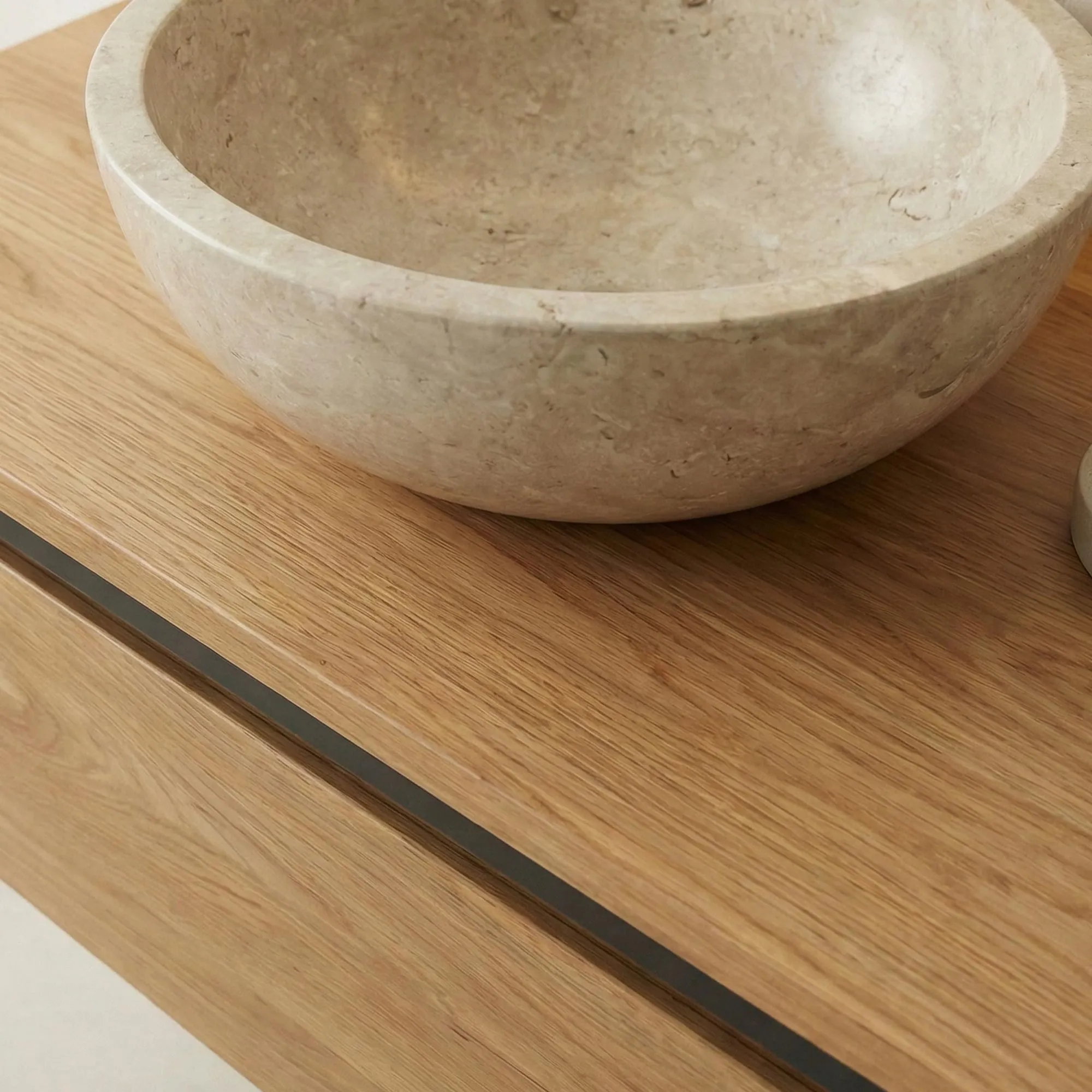 Ce meuble est vendu sans vasques, avec un plateau non percé, pour vous permettre d’y insérer la (les) vasque(s) de votre choix à encastrer ou à poser. Afin d’accessoiriser votre meuble, venez découvrir notre gamme de vasques en pierre et créez votre propre ambiance personnalisée. Votre meuble sera unique.