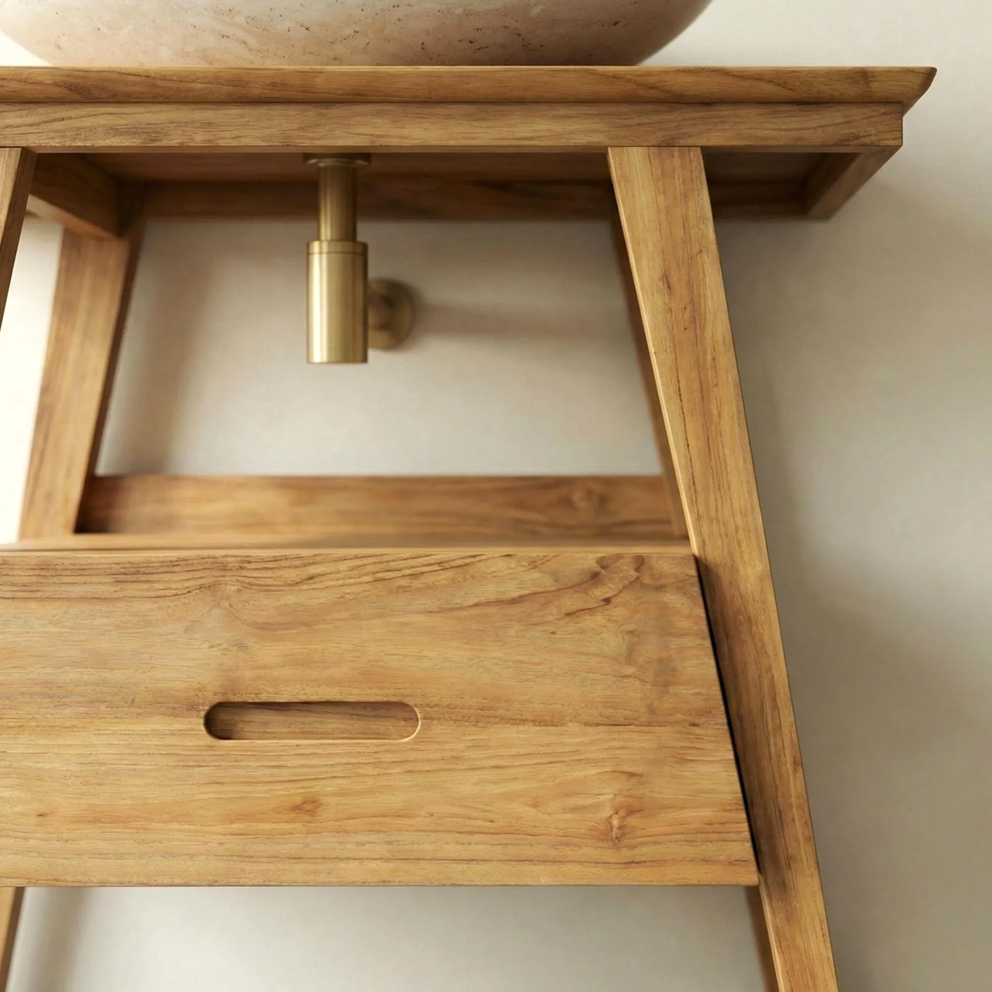 Fabriqué avec soin en Teck massif, ce meuble de salle de bain incarne la beauté naturelle et la durabilité du bois exotique. Les finitions en Teck mettent en valeur son aspect authentique et élégant, tandis que la conception unique des pieds en trapèze ajoute une touche de modernité et de sophistication à l'ensemble.