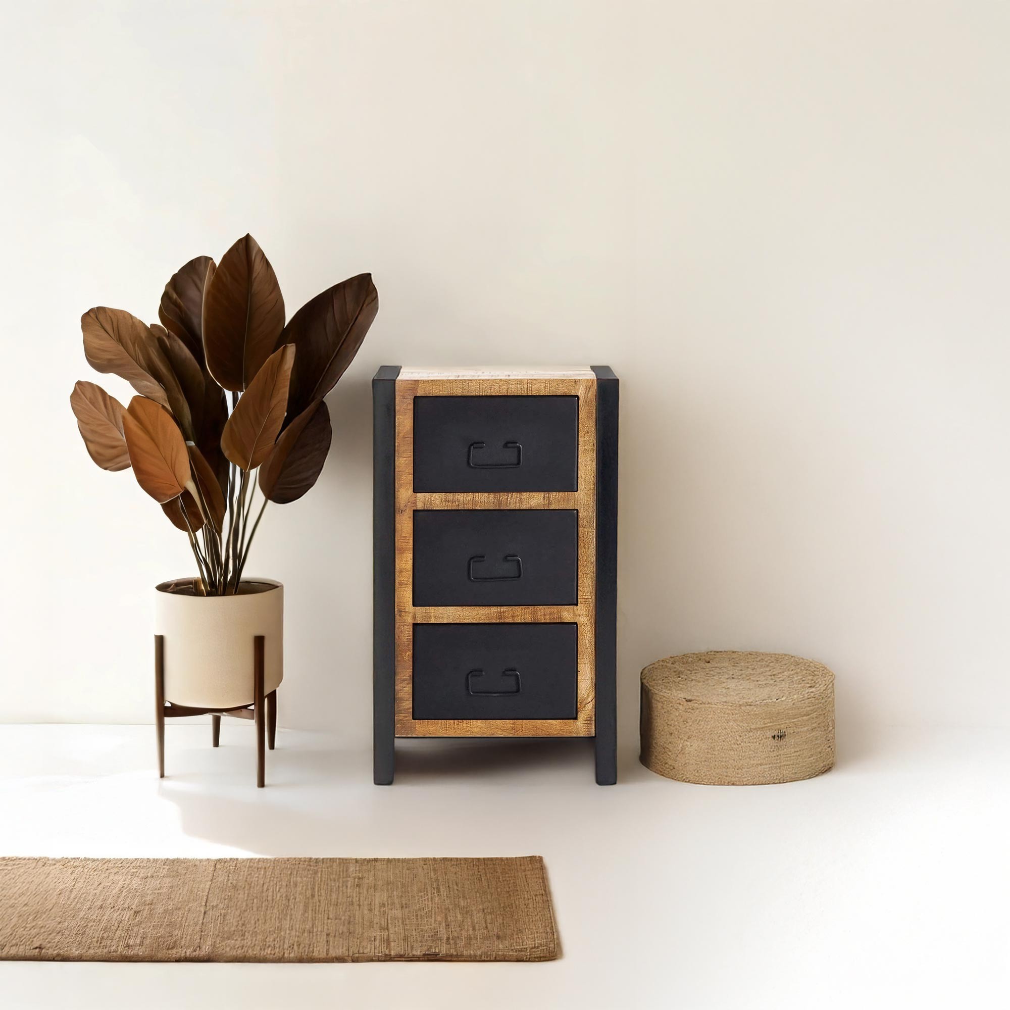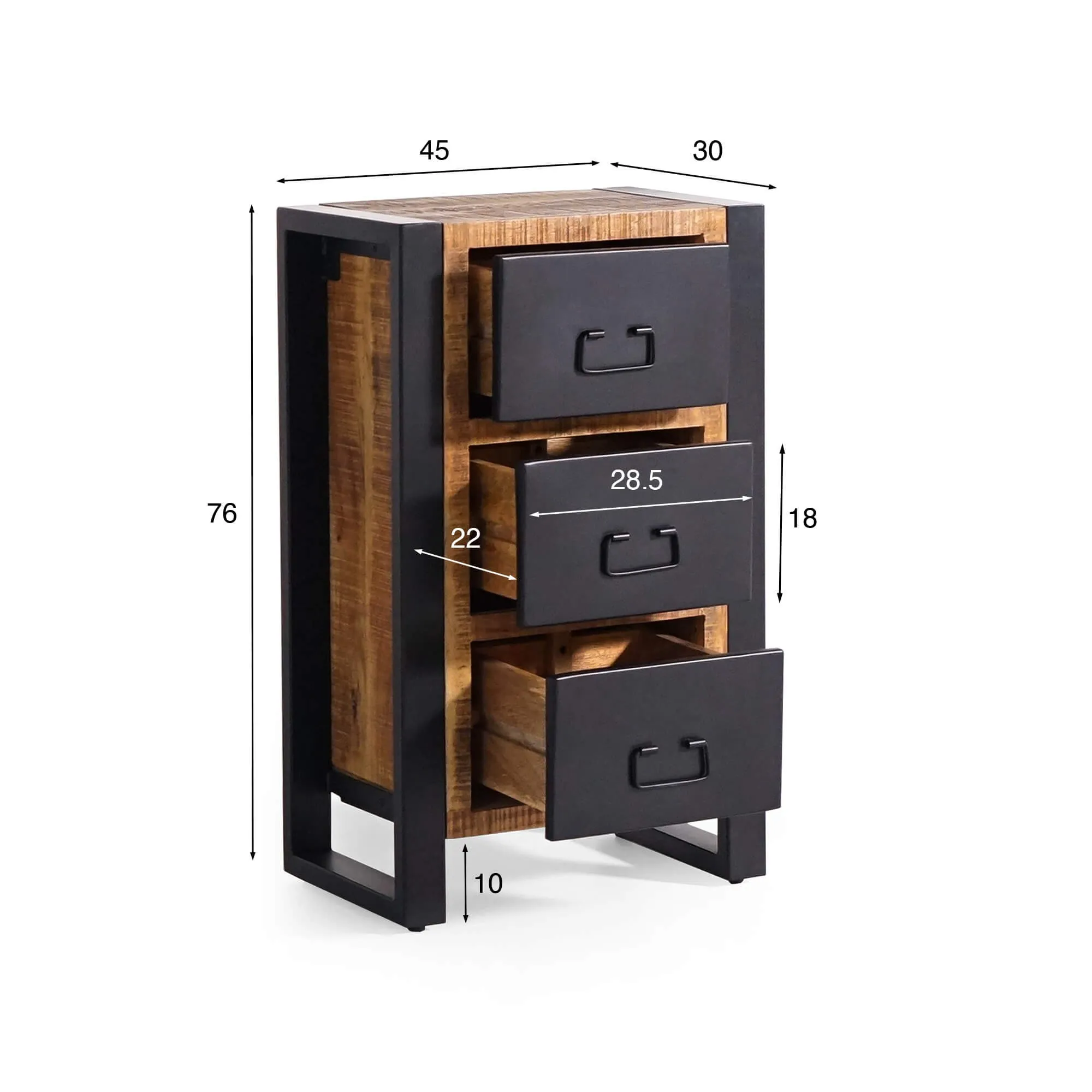 Cette commode, haute de 76 cm, en bois et métal, possède 3 tiroirs de 29 cm de large sur 18 cm de haut. La structure est en bois massif et ceux-ci disposent d’une façade en métal avec une poigné sobre inspirée des casiers vestiaires.