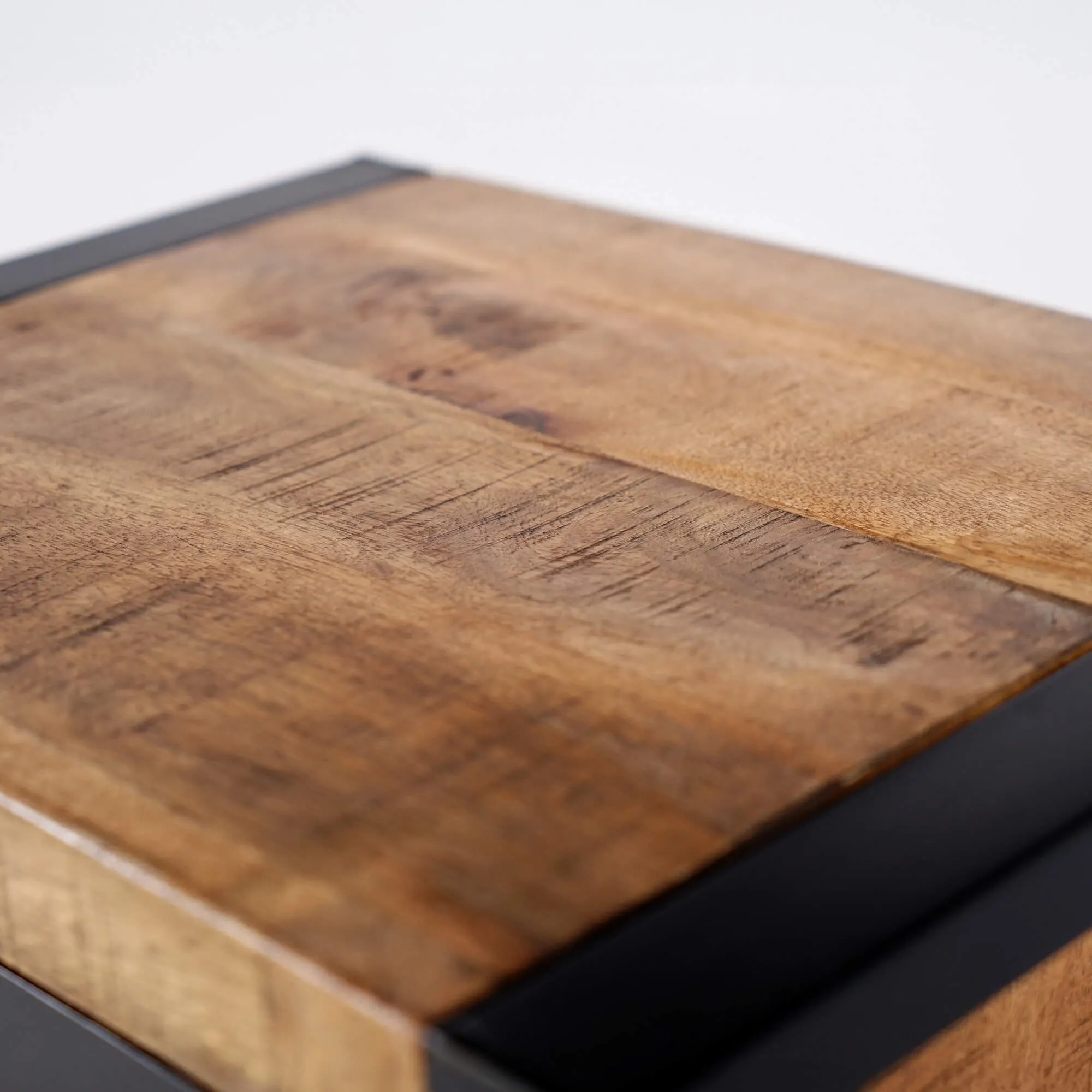 Le bois de manguier est un bois exotique dense venant d’Inde reconnu pour sa grande résistance. Les planches utilisées sont irrégulières et laissées dans un aspect brut. La couleur et le dessin des stries de coupe varient selon la nature des planches qui ont servi à l’assemblage. La fabrication est artisanale et chaque meuble est unique, disposant de ses propres nuances issues des caractéristiques naturelles du bois.