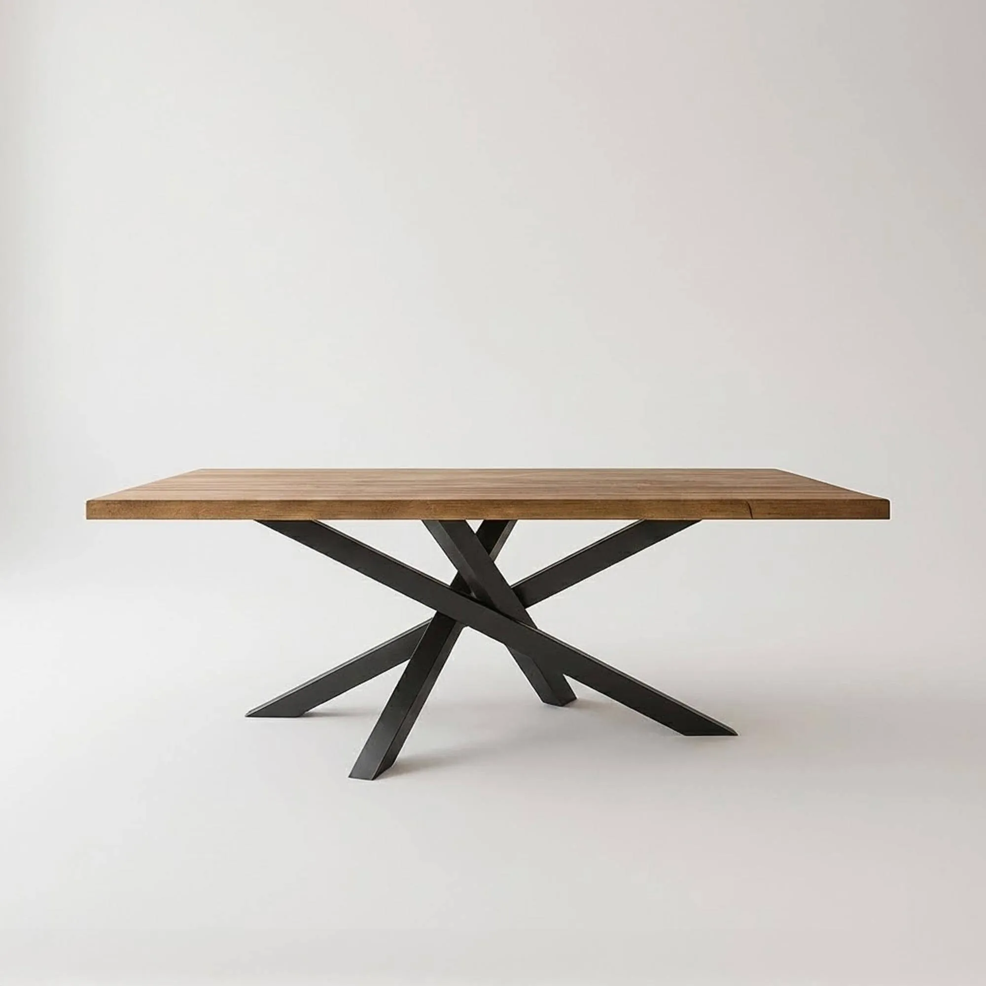 Les pieds de cette table de salle à manger en bois massif à pied mikado en métal, faciles à monter grâce à un système ingénieux de vis et d'écrous invisibles, sont en métal noir mat, ajoutant une touche moderne à l'ensemble. La particularité de cette table réside dans ses quatre pieds qui partent du centre pour s'entremêler harmonieusement. Cette conception confère à la table une grande stabilité et un aspect visuel unique qui ne manquera pas de captiver l'attention de vos invités.