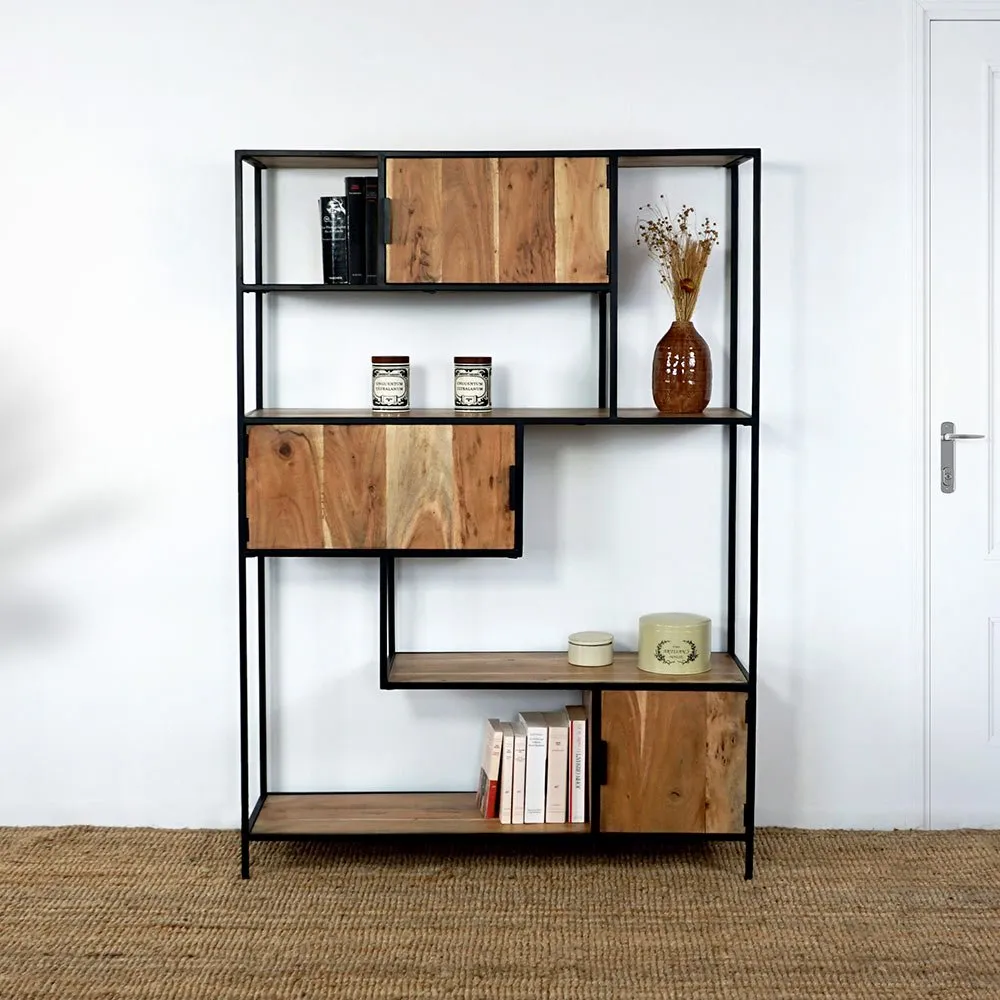 Etagère bibliothèque industrielle bois et métal avec portes
