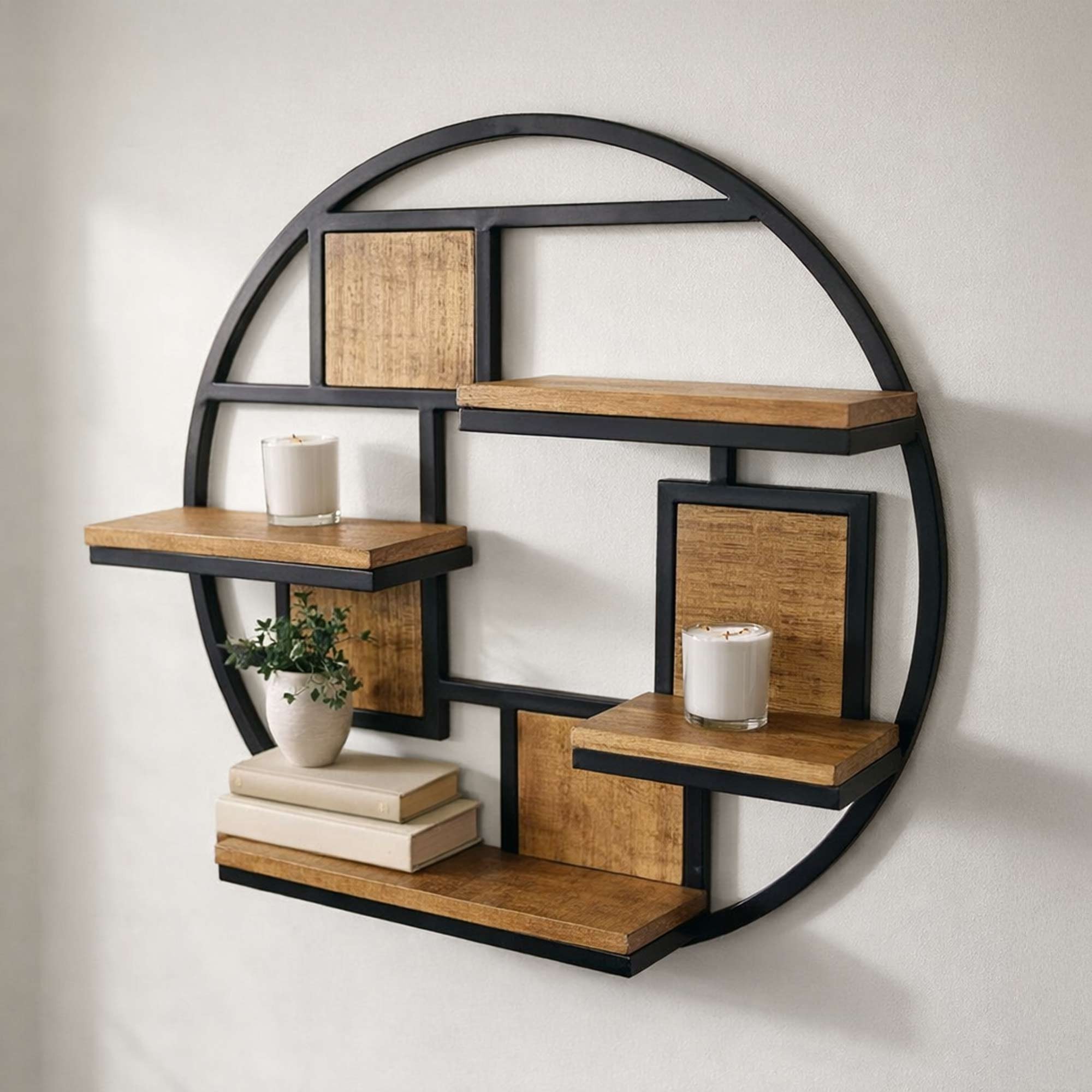 Le mélange de métal industriel et de bois chaleureux fait de cette étagère ronde une addition versatile à tout intérieur. Qu’elle soit placée dans une entrée pour accueillir des clés et du courrier, dans un salon pour des objets d’art, ou même dans une cuisine pour des épices et des herbes, elle s’adapte à chaque contexte en apportant sa propre touche d’élégance fonctionnelle.