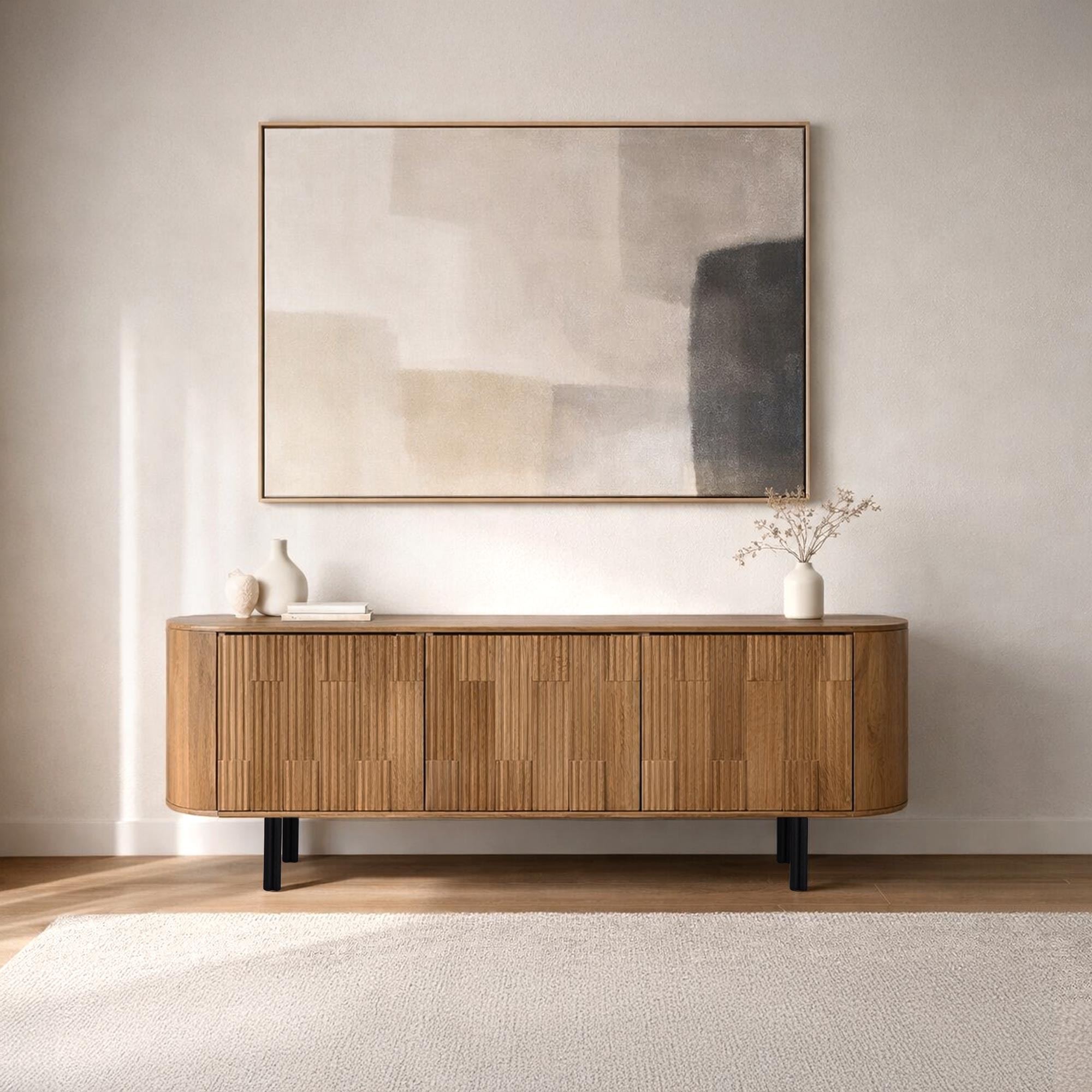 Doté de trois portes battantes, ce meuble offre un espace de rangement ample et organisé. Derrière chaque porte, un compartiment est divisé par une étagère horizontale, permettant de séparer et d’organiser efficacement vos objets. Que ce soit pour des livres, des appareils multimédia ou des objets décoratifs, chaque section est pensée pour faciliter l'accès et maximiser l'espace.