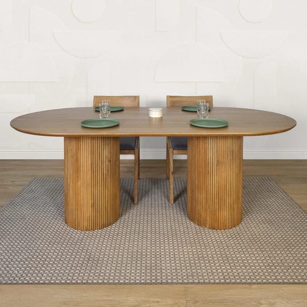 La table "Thanais" se distingue par sa simplicité élégante, où le bois massif de manguier est travaillé avec soin. La base de la table, solide et rassurante, est notable pour ses pieds en bois massif. Ceux-ci ont été finement ouvragés pour présenter des ondulations régulières, conférant à la table un aspect visuel à la fois doux et structuré. Cette conception des pieds n'est pas qu'une prouesse esthétique, elle reflète également le savoir-faire artisanal, avec un œil attentif porté sur chaque détail pour garantir la qualité et la précision du travail.