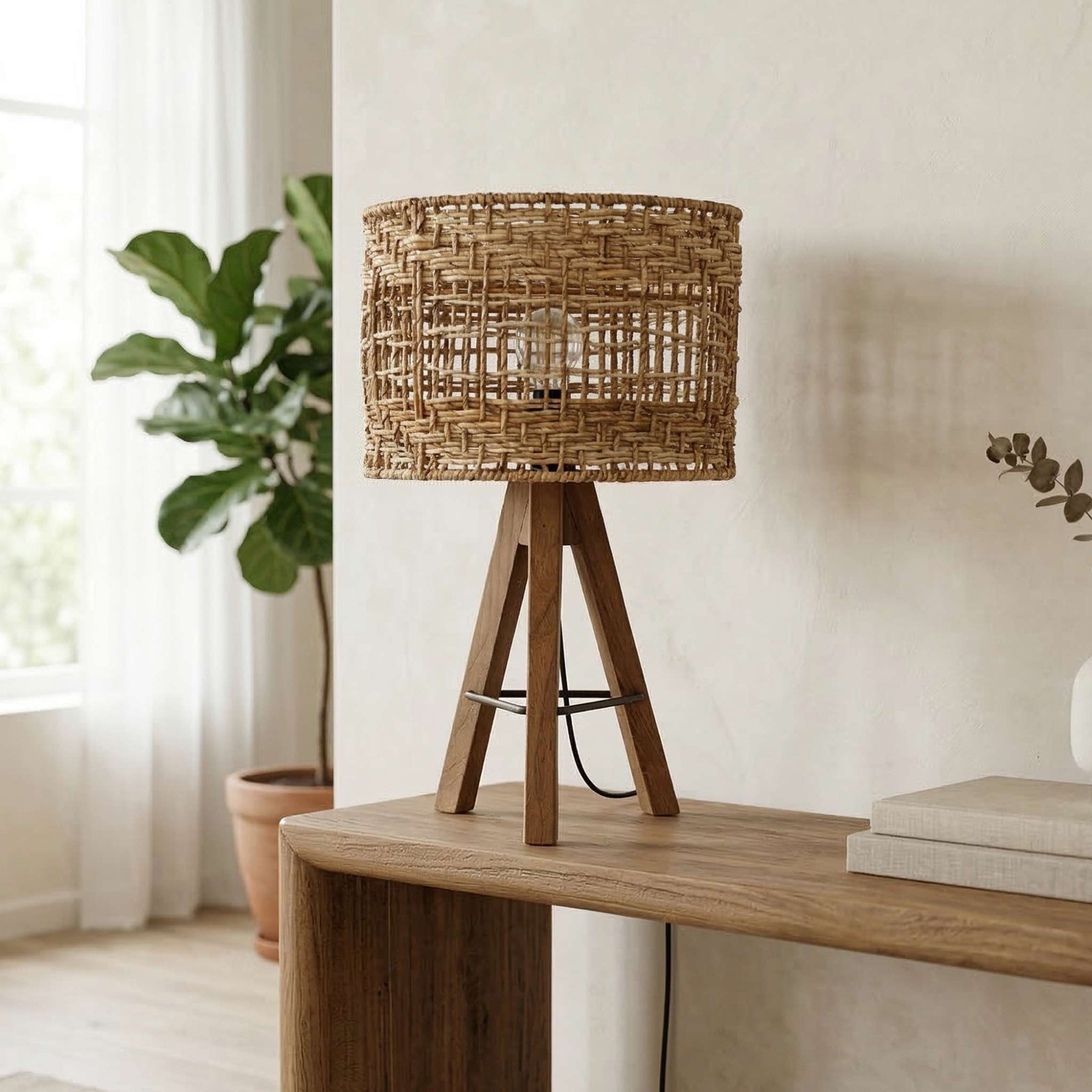 L'abat-jour en rotin tressé laisse subtilement apparaître l'ampoule à travers ses entrelacements, créant ainsi une atmosphère chaleureuse et apaisante. Le mariage entre la texture brute du bois et la légèreté du rotin confère à cette lampe un charme intemporel qui se marie aussi bien avec des intérieurs modernes que plus traditionnels. Parfaitement équilibrée entre design artisanal et fonctionnalité, elle s'intègre facilement dans un salon, une chambre ou un espace de travail, ajoutant une touche naturelle et chic à votre décoration.