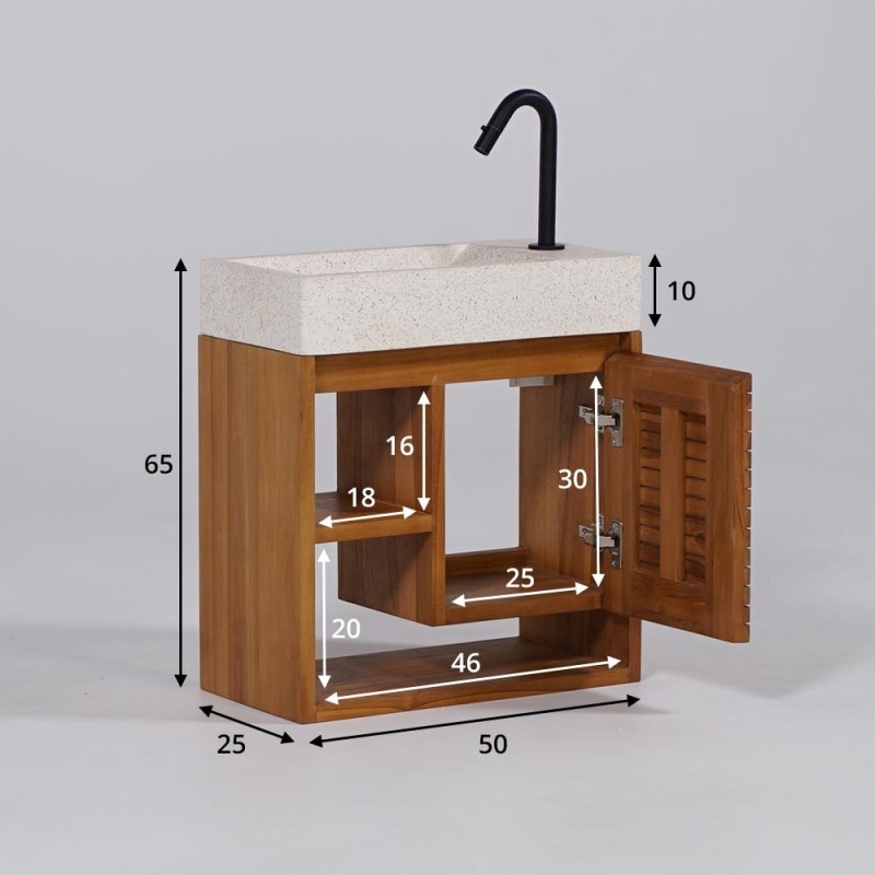 Meuble lave-mains suspendu en bois de teck massif et vasque en terrazzo blanc - Balamani