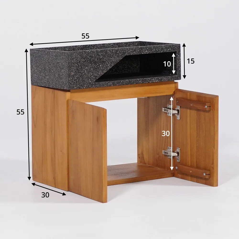 L’installation est un jeu d’enfant : le meuble est livré déjà monté, prêt à être fixé. Sa fabrication artisanale met en lumière une attention particulière aux détails et aux finitions, témoignant du savoir-faire unique derrière chaque pièce. Le teck massif, réputé pour sa robustesse et sa résistance à l’humidité, assure une durabilité exceptionnelle, tandis que la surface en terrazzo noir apporte une touche contemporaine et chic.