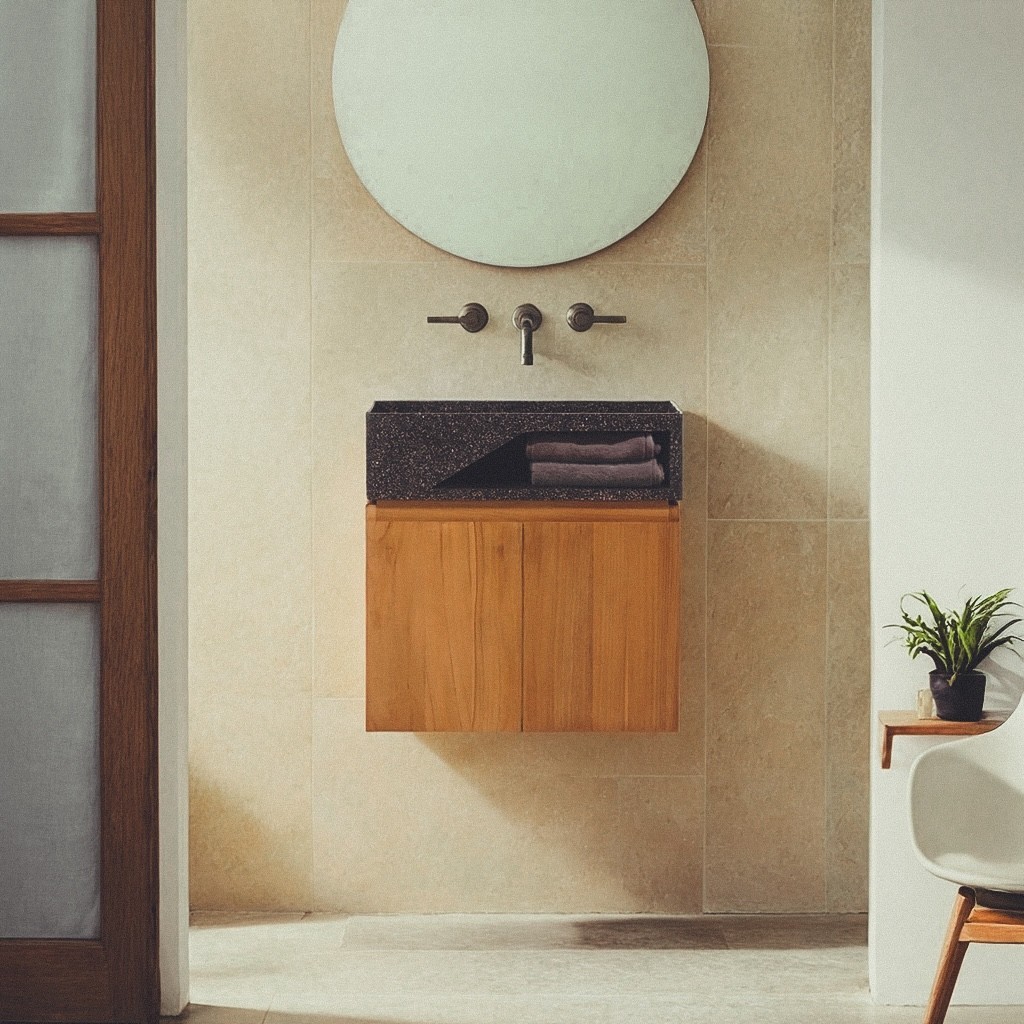 Laissez-vous séduire par l’élégance minimaliste et l’ingéniosité du meuble lave-mains suspendu, issu de la collection Tanja. Conçu avec soin à partir de teck massif, ce meuble allie le charme intemporel du bois à une esthétique résolument moderne, inspirée du design scandinave. La douceur des lignes épurées et la teinte chaleureuse du teck se marient parfaitement avec la vasque en terrazzo noir, offrant un contraste saisissant et sophistiqué.