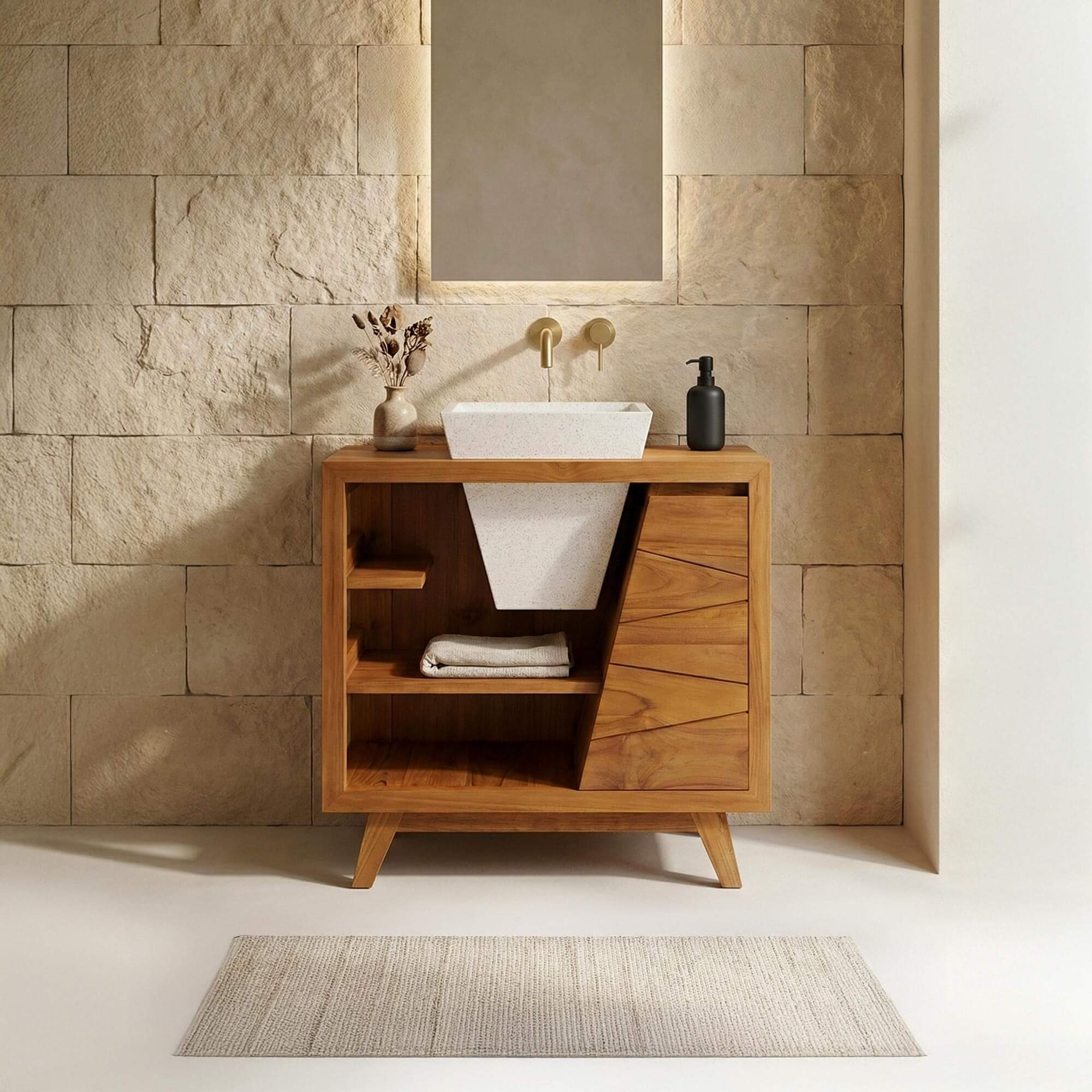 Meera Meuble de salle de bain en teck massif et vasque en terazzo blanc - Meera