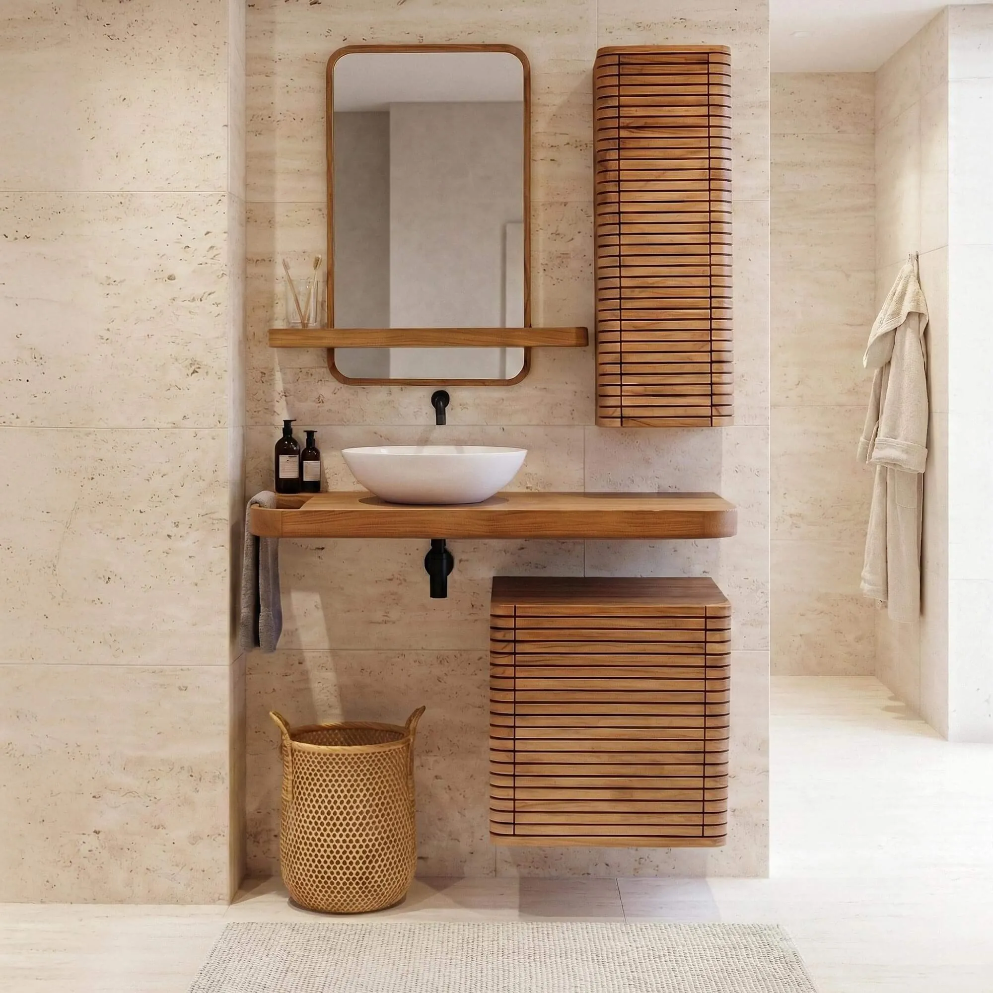 Fabriqué en bois massif de teck, reconnu pour sa robustesse et sa résistance naturelle à l'humidité, ce meuble allie durabilité et raffinement. Les lattes soigneusement alignées sur sa porte battante créent un jeu subtil de lignes qui lui confèrent une identité visuelle unique. Derrière cette porte ingénieusement pensée, un compartiment spacieux (41 cm de hauteur, 42 cm de largeur et 32 cm de profondeur) offre un rangement pratique pour vos essentiels de salle de bain.
