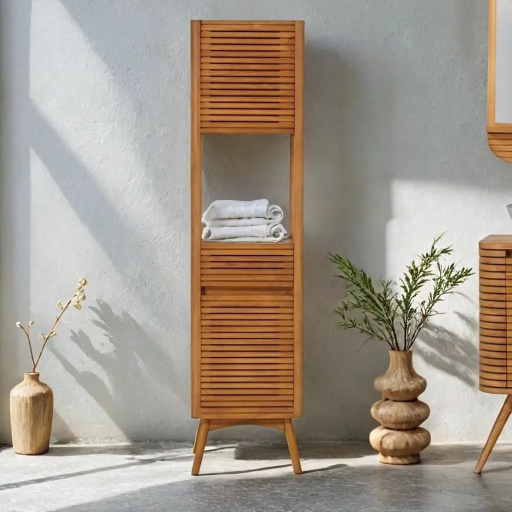La colonne de salle de bain en teck massif de la collection Kama incarne l'élégance scandinave dans toute sa splendeur. Conçue pour sublimer votre espace tout en offrant un rangement fonctionnel, elle allie avec subtilité design et praticité.