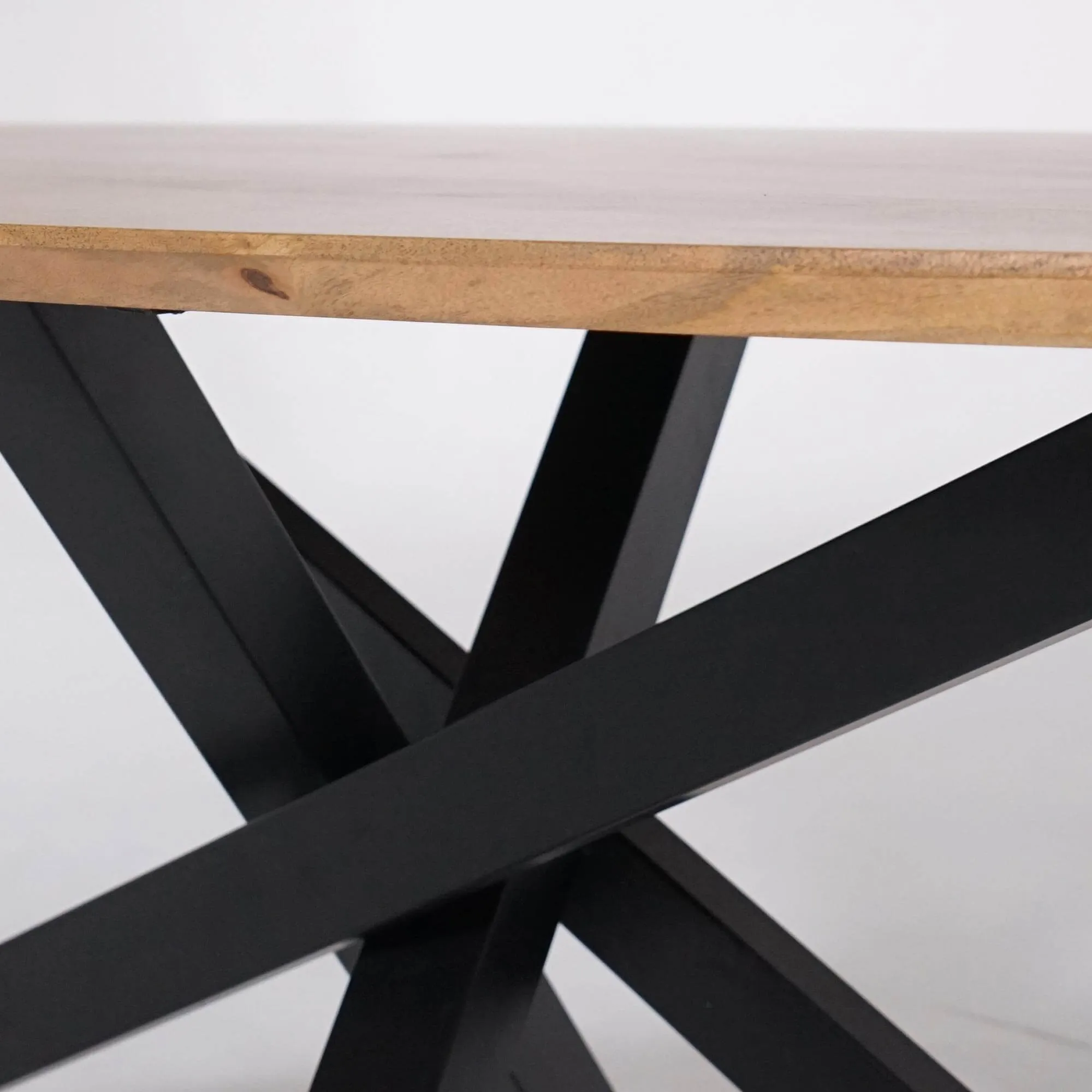 Sous le plateau de cette table de salle à manger ovale en bois massif à pied mikado en métal, le piètement en métal noir dessine une structure dynamique et affirmée. Les lignes obliques se croisent avec précision, assurant une excellente stabilité tout en libérant l’espace pour les jambes. Cette conception étudiée permet à chacun de s’installer librement, sans contrainte, et renforce le confort d’usage au quotidien. Le contraste entre le métal mat et le bois massif crée une tension visuelle maîtrisée, signature d’un style industriel revisité avec sobriété.