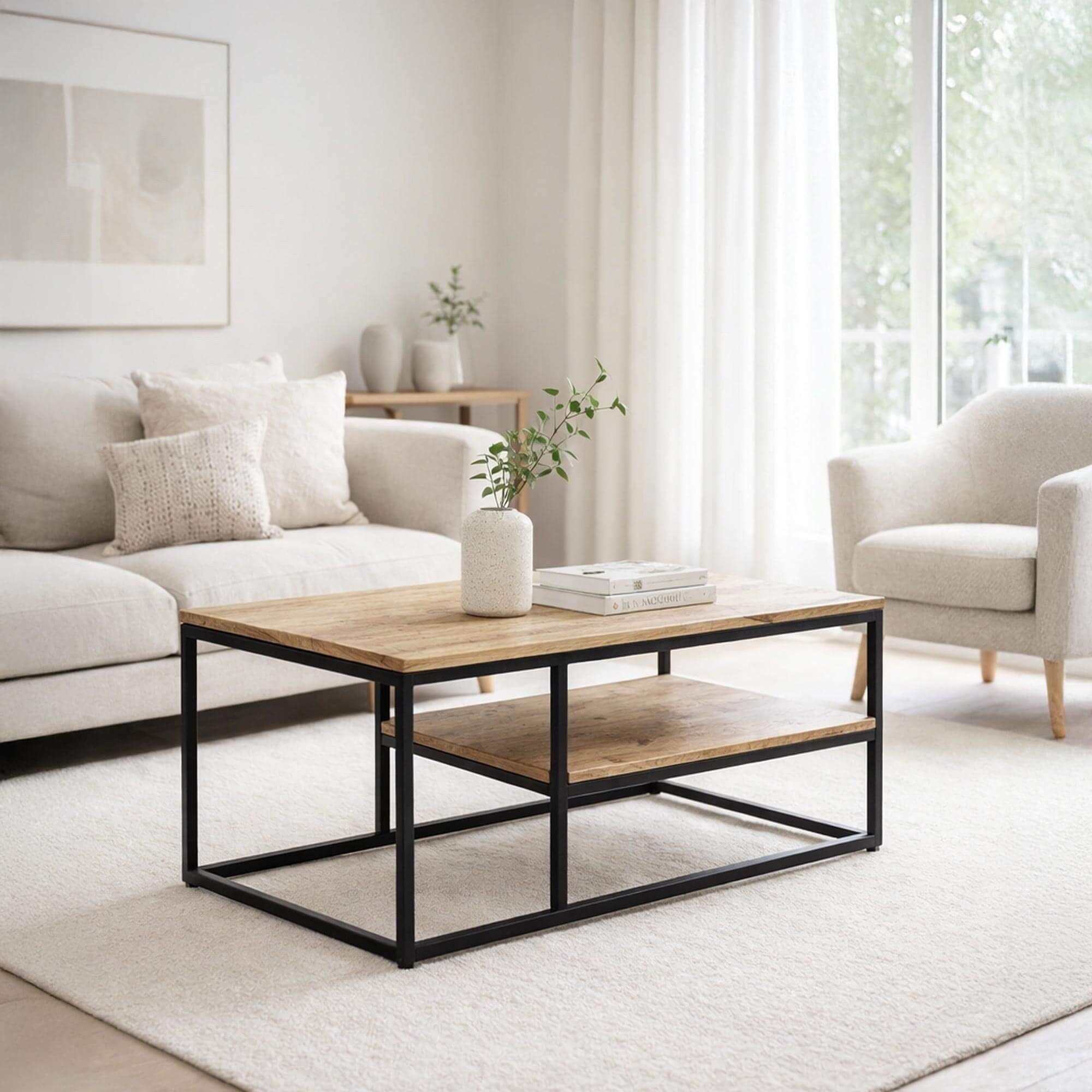 Table basse en bois avec plateau inférieur et structure en métal