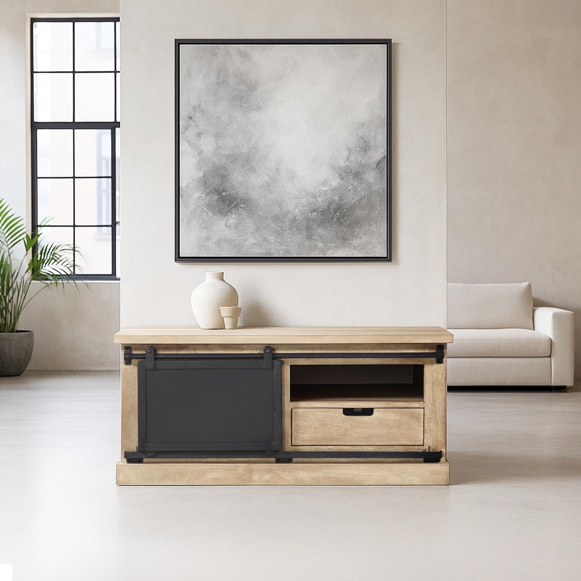 Inspiré par l’authenticité brute et l’héritage industriel de la ville de Detroit, ce meuble TV de 100 cm incarne une esthétique fonctionnelle, pensée pour les intérieurs qui misent sur le caractère autant que sur l’efficacité. Fabriqué en bois massif de manguier, il révèle une essence naturellement texturée, sublimée par des finitions soignées qui contrastent élégamment avec la façade en métal anthracite de sa porte coulissante. Ce jeu de matières crée un équilibre visuel saisissant, à la fois sobre et audacieux.