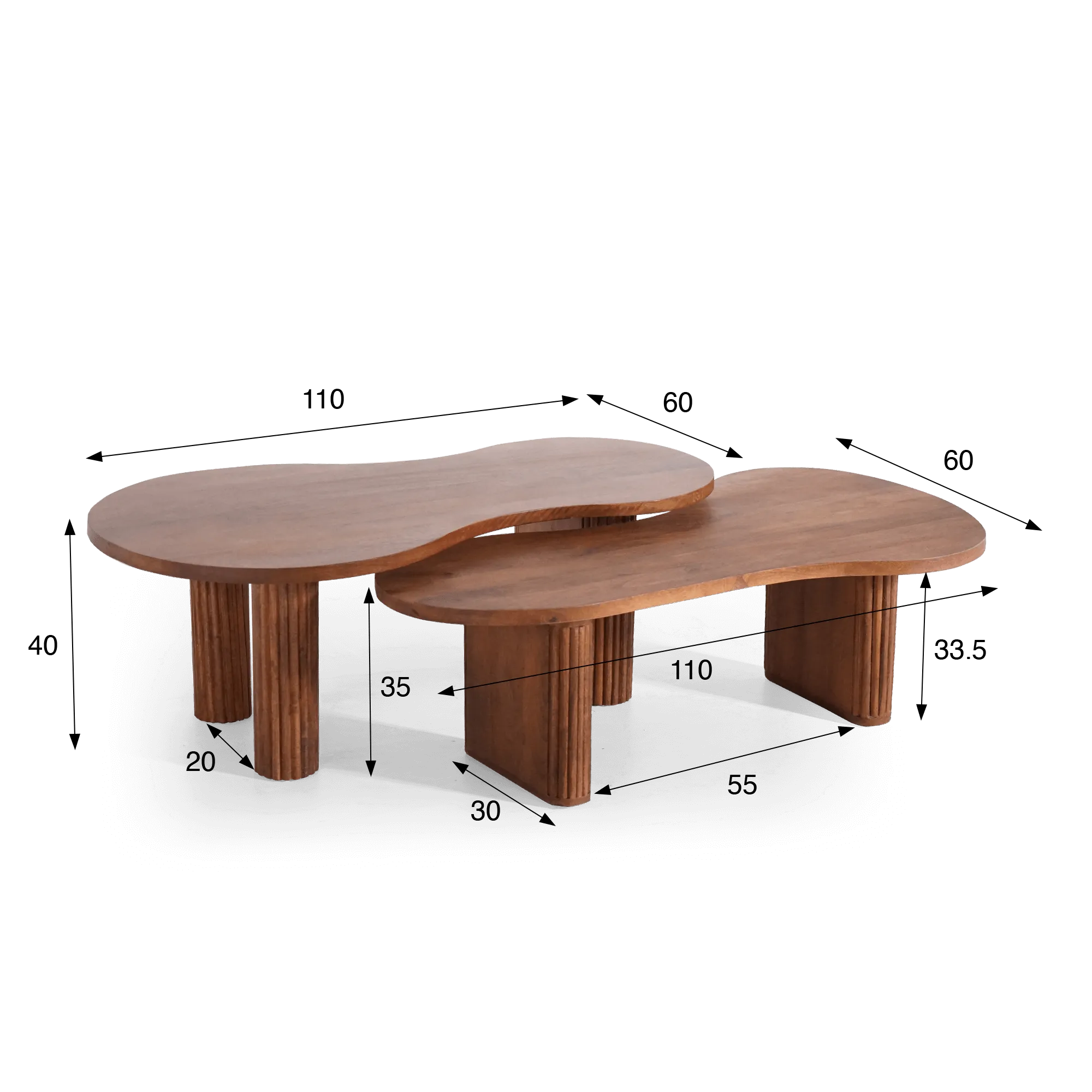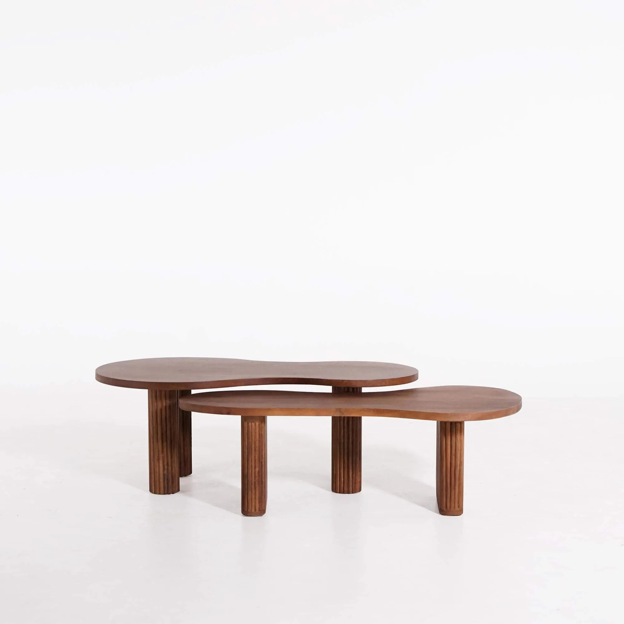 Fabriquées artisanalement en bois massif de manguier, cet ensemble de 2 tables basses en bois massif se distingue par la beauté naturelle de leurs veines et par leurs finitions soignées. Le ton chaud du bois révèle toute la richesse de son essence, tandis que le travail délicat de la structure met en avant le savoir-faire de nos ateliers. Chaque plateau, d’une épaisseur généreuse, présente des courbes douces et asymétriques, évoquant le dessin libre de la nature.
