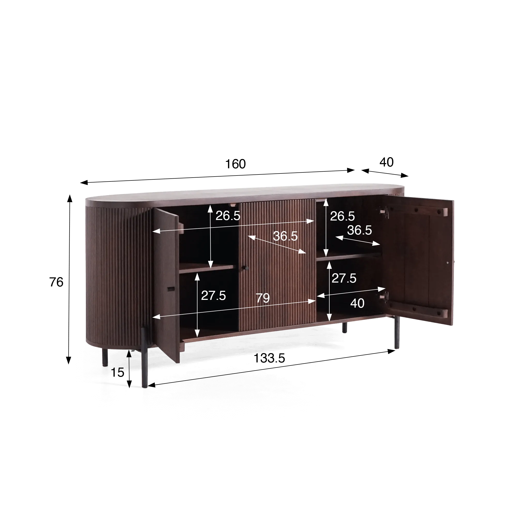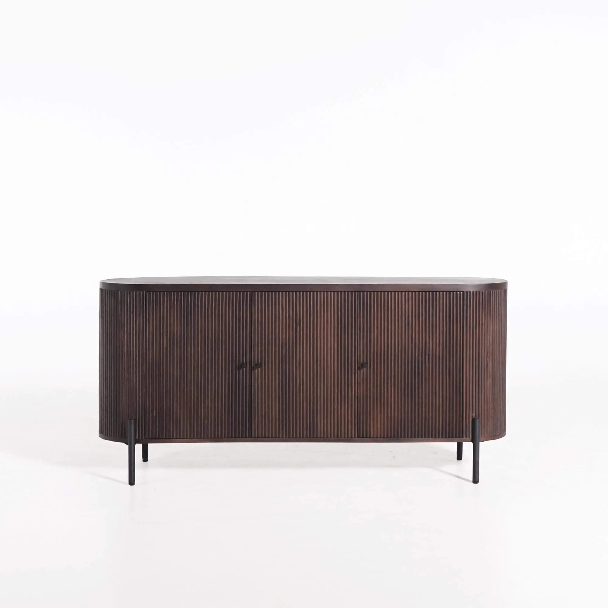 Réalisé en bois massif, ce buffet 3 portes en bois de manguier révèle la richesse d’un bois noble dont la texture vivante et les teintes brunes profondes captent naturellement la lumière. Sa surface rainurée, réalisée artisanalement, compose un rythme visuel apaisant et met en valeur la silhouette ovale du meuble. Les pieds en métal noir, fins et sobres, renforcent le contraste des matières et apportent une touche de modernité à l’ensemble.
