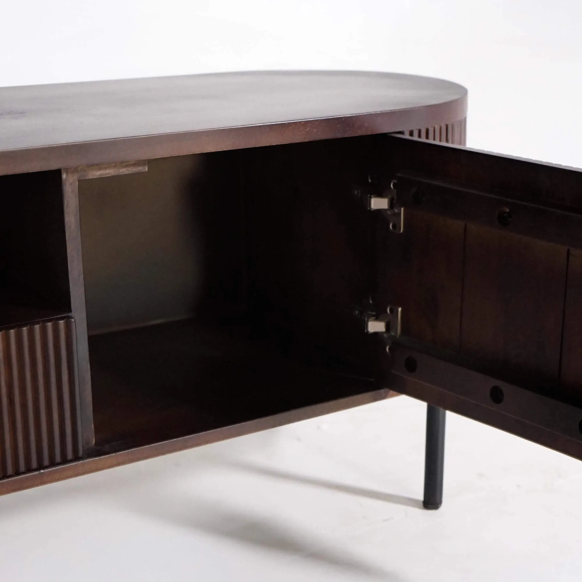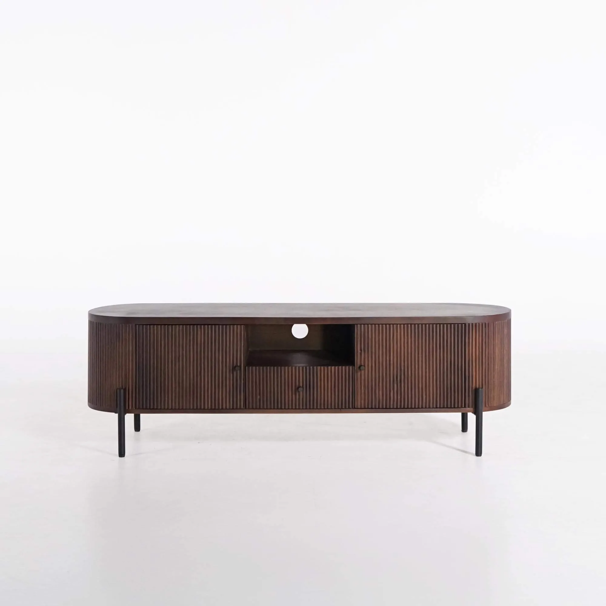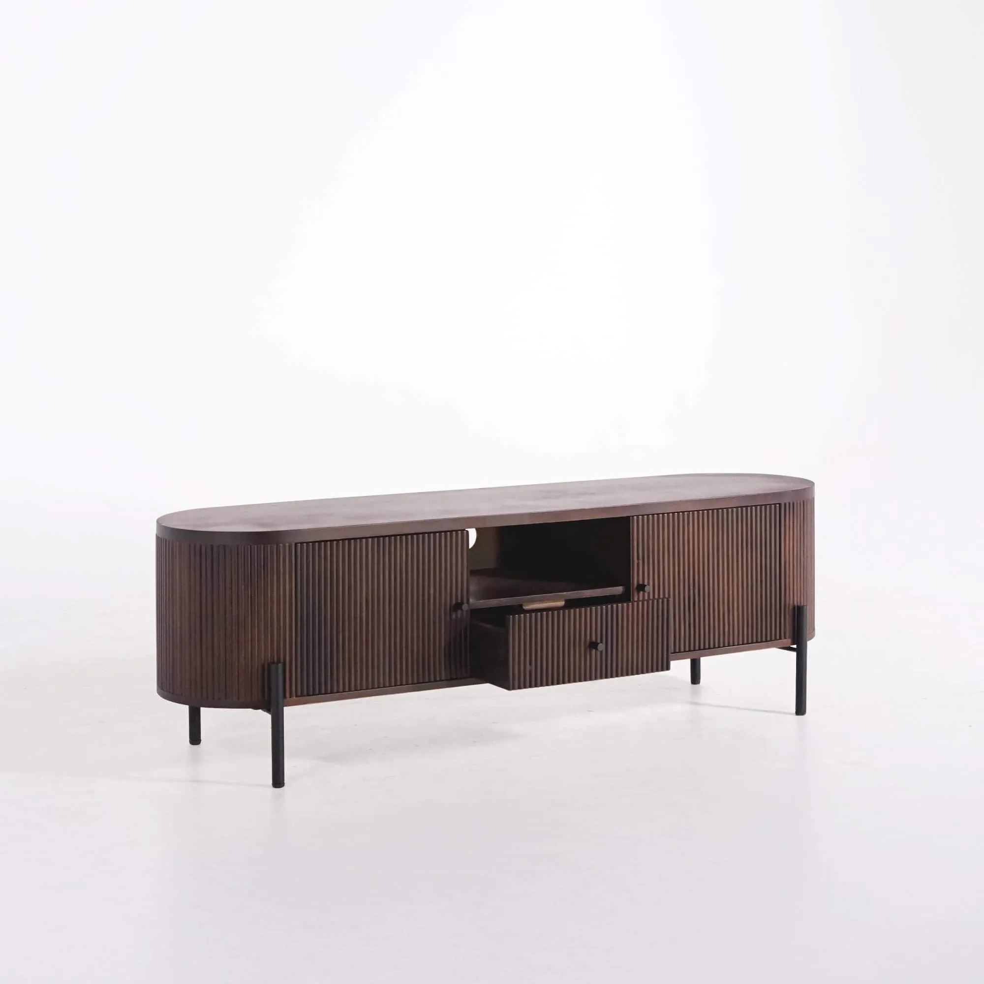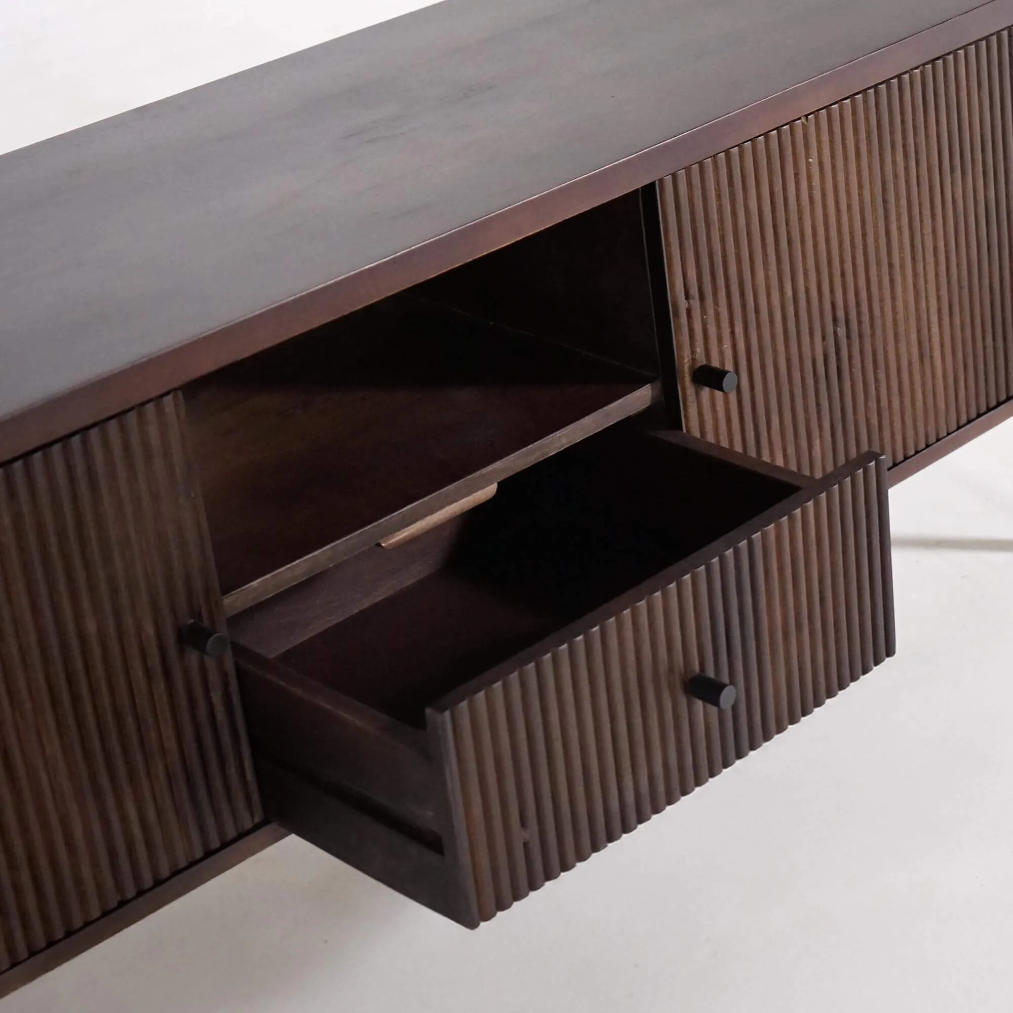 Fabriqué en manguier massif, ce meuble TV en bois de manguier révèle une finition manuelle soigneusement travaillée qui met en valeur les nuances brunes profondes du bois. La façade rainurée, typique de la collection Sohana, capte la lumière avec subtilité et offre un jeu d’ombres raffiné qui anime la surface. Les pieds en métal noir, fins et légèrement décalés, renforcent la légèreté visuelle du meuble tout en garantissant une stabilité parfaite.
