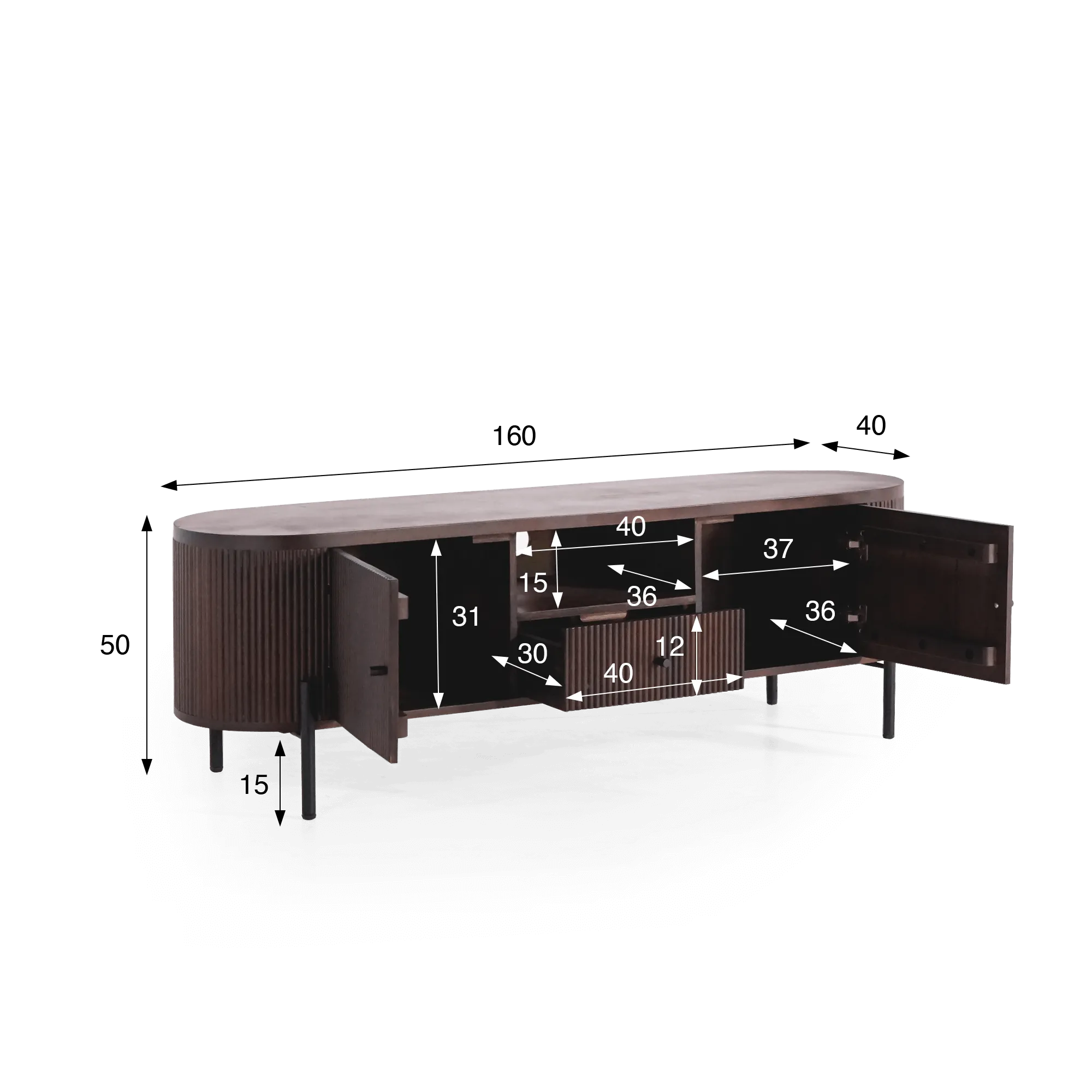 Derrière ses deux portes battantes équipées du système push-pull à fermeture soft close, ce meuble TV en bois de manguier dissimule des compartiments de rangement spacieux de 36 cm de profondeur, idéaux pour accueillir vos équipements multimédia ou vos accessoires. Un tiroir central offre un espace supplémentaire pour télécommandes, câbles ou magazines, tandis que la niche ouverte de 40 cm de largeur est dotée d’un passe-câble discret, garantissant une organisation fluide et esthétique de vos appareils électroniques. Avec ses dimensions de 160 × 40 × 50 cm, ce meuble TV en bois de manguier se veut aussi fonctionnel que raffiné.