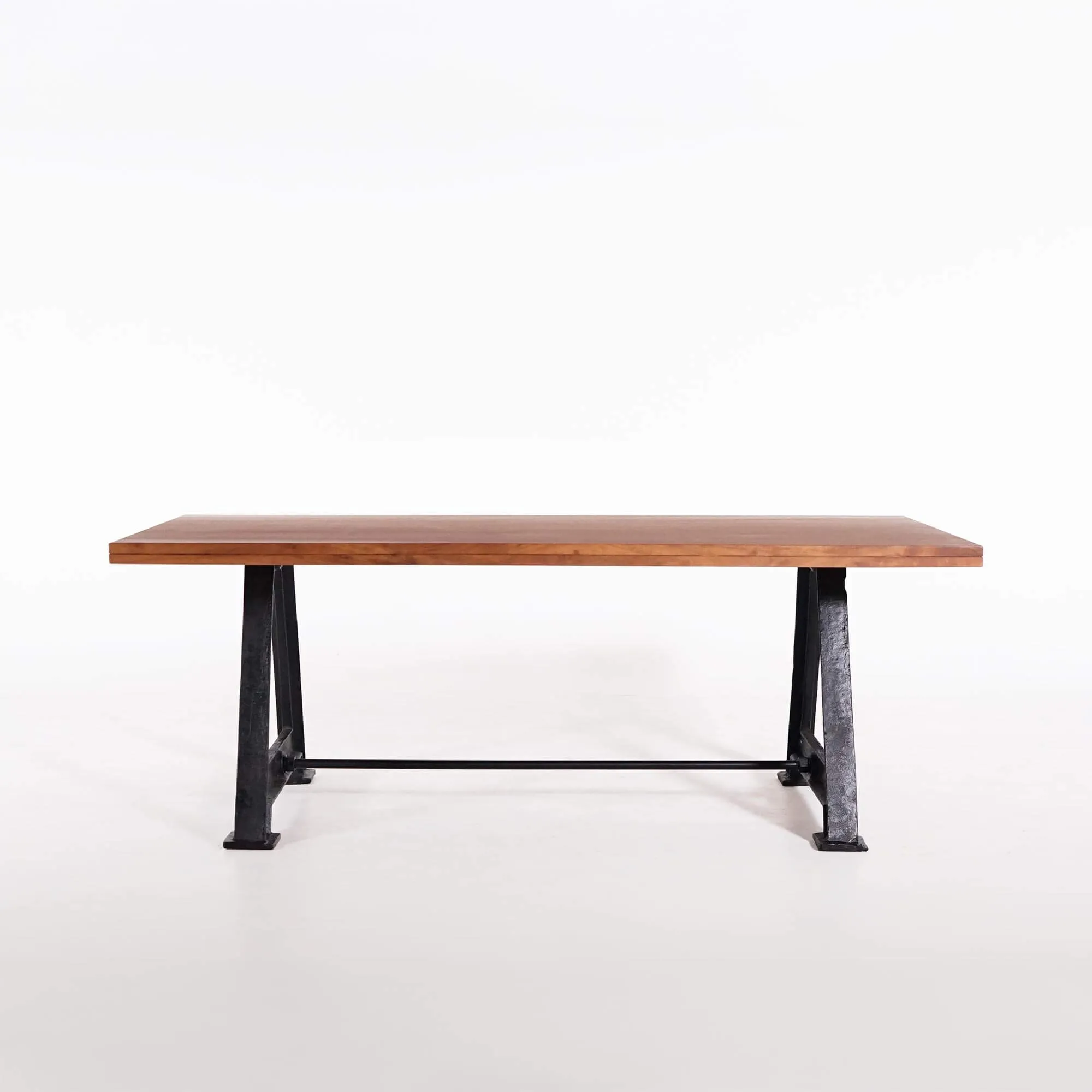 Le piètement en fonte noire de cette table à manger de style industriel en bois massif, inspiré des structures métalliques industrielles, confère à l’ensemble une stabilité remarquable. Ses lignes inclinées et son entretoise centrale soulignent une conception à la fois fonctionnelle et graphique, pensée pour traverser le temps sans perdre de sa modernité. Ce contraste entre la chaleur du bois et la froideur du métal noir crée un équilibre esthétique fort, fidèle à l’esprit industriel de nos collections phare.