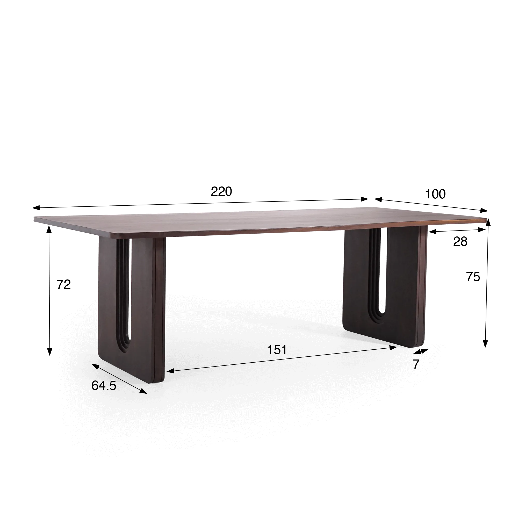 Réalisée en bois massif de manguier, notre table à manger en bois massif de manguier Noba séduit par la richesse de sa teinte marron profond et par la douceur satinée de sa finition. Le plateau de 220 × 100 cm, d’une épaisseur de 3 cm, repose sur deux pieds pleins au dessin architectural : leur forme en U, travaillée avec précision, introduit une dimension graphique et une stabilité remarquable. Ce contraste entre la légèreté visuelle du plateau et la puissance de la base crée une harmonie subtile, fidèle à la philosophie qui a mené à sa conception.