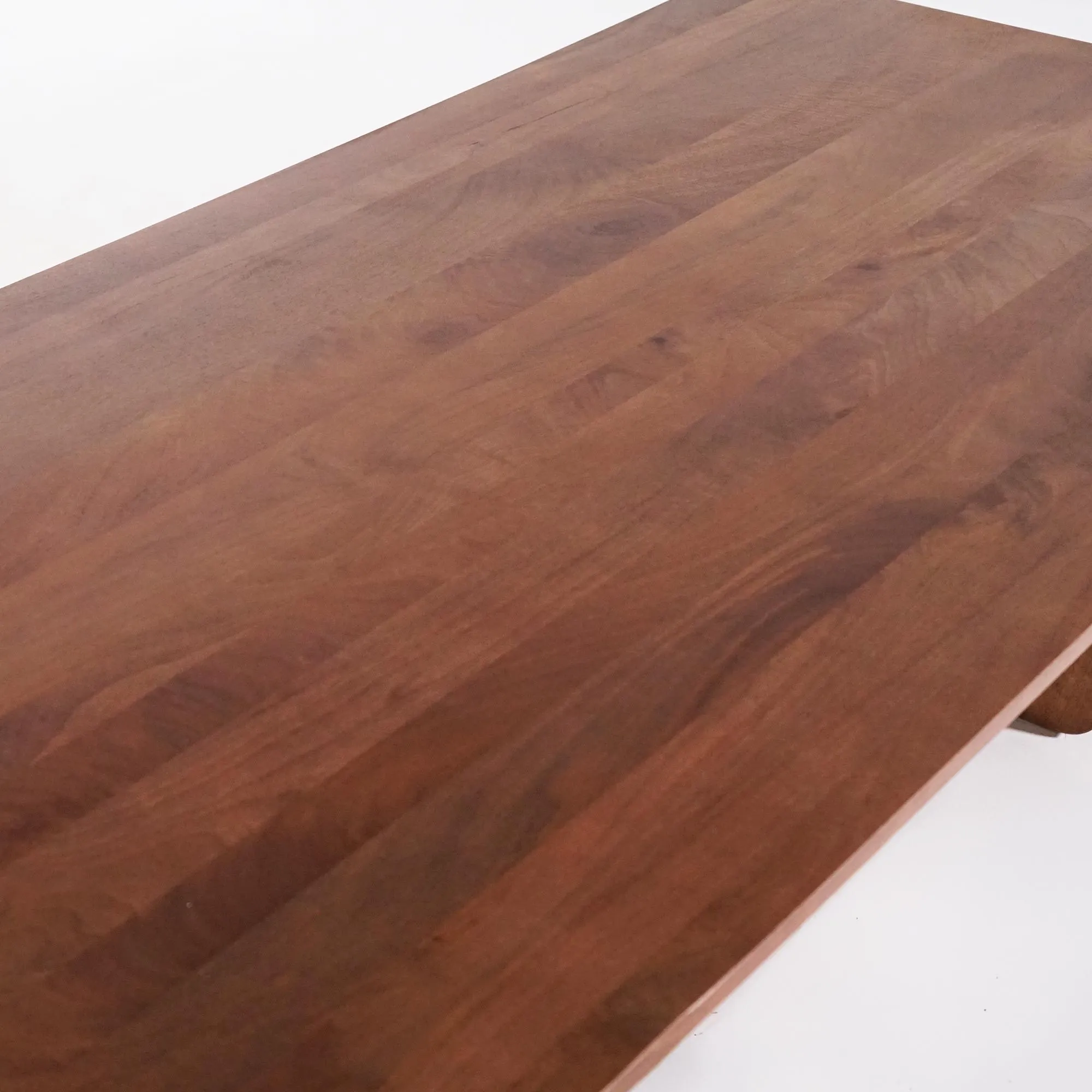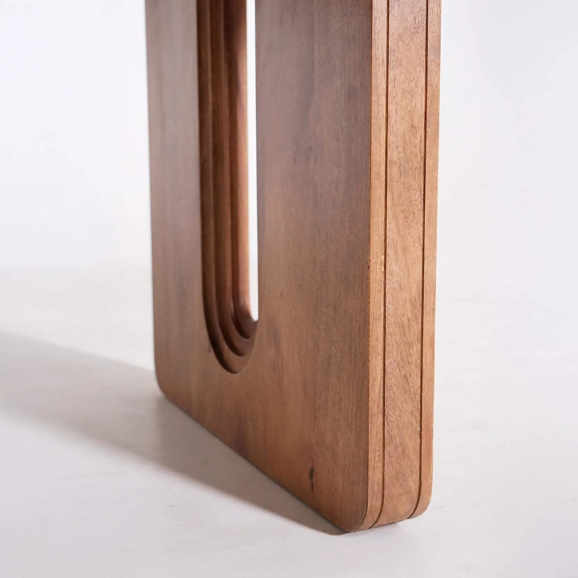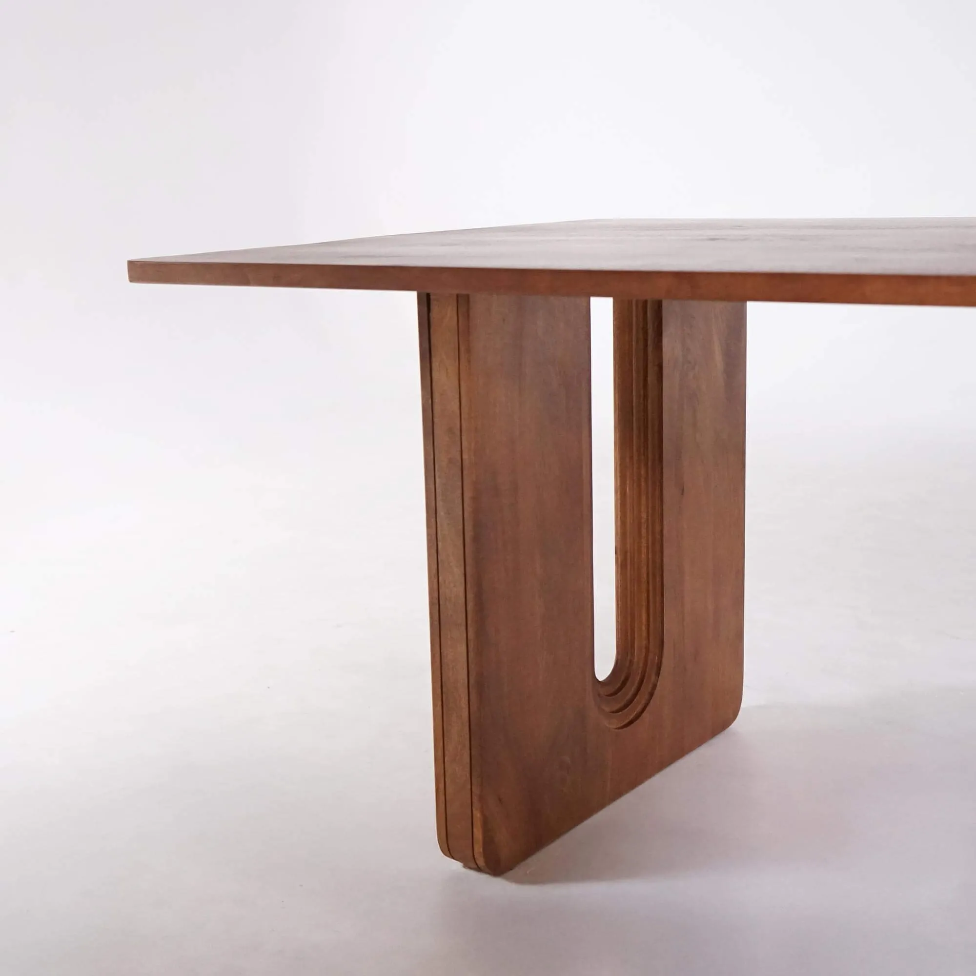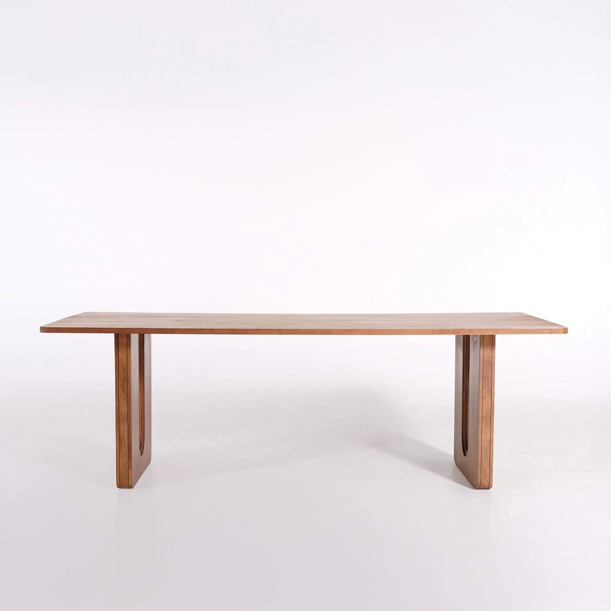 Fabriquée en bois massif de manguier, la table à manger en bois massif Noba révèle toute la richesse de cette essence noble. Sa teinte brun naturel, légèrement ambrée, joue avec la lumière pour créer une atmosphère chaleureuse et apaisante. Le plateau, aux dimensions généreuses de 200 × 100 cm, repose sur deux pieds sculpturaux en forme de U, travaillés dans la même matière. Leur design, à la fois géométrique et fluide, structure visuellement l’ensemble et confère à la table une présence sculpturale forte.