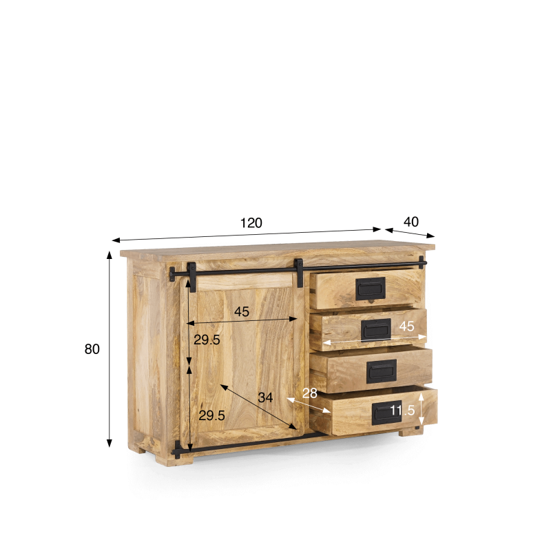 Sa structure robuste de ce meuble sous vasques en bois massif abrite une organisation intérieure parfaitement étudiée : quatre tiroirs alignés sur la droite permettent de ranger avec aisance les accessoires de toilette, serviettes ou produits de soin. Le premier tiroir est compartimenté pour faciliter le passage de l'évacuation de la vasque de droite. Chaque tiroir affiche une belle profondeur de 28 cm et une hauteur de 11,5 cm, offrant un volume de rangement optimal. Sur la gauche, une porte coulissante en bois massif montée sur rail en métal noir s’ouvre pour dévoiler un grand compartiment divisé en deux niches (29,5 cm de hauteur pour chacune, 45 cm de largeur et 34 cm de profondeur), parfaites pour accueillir paniers, flacons ou linge de bain.