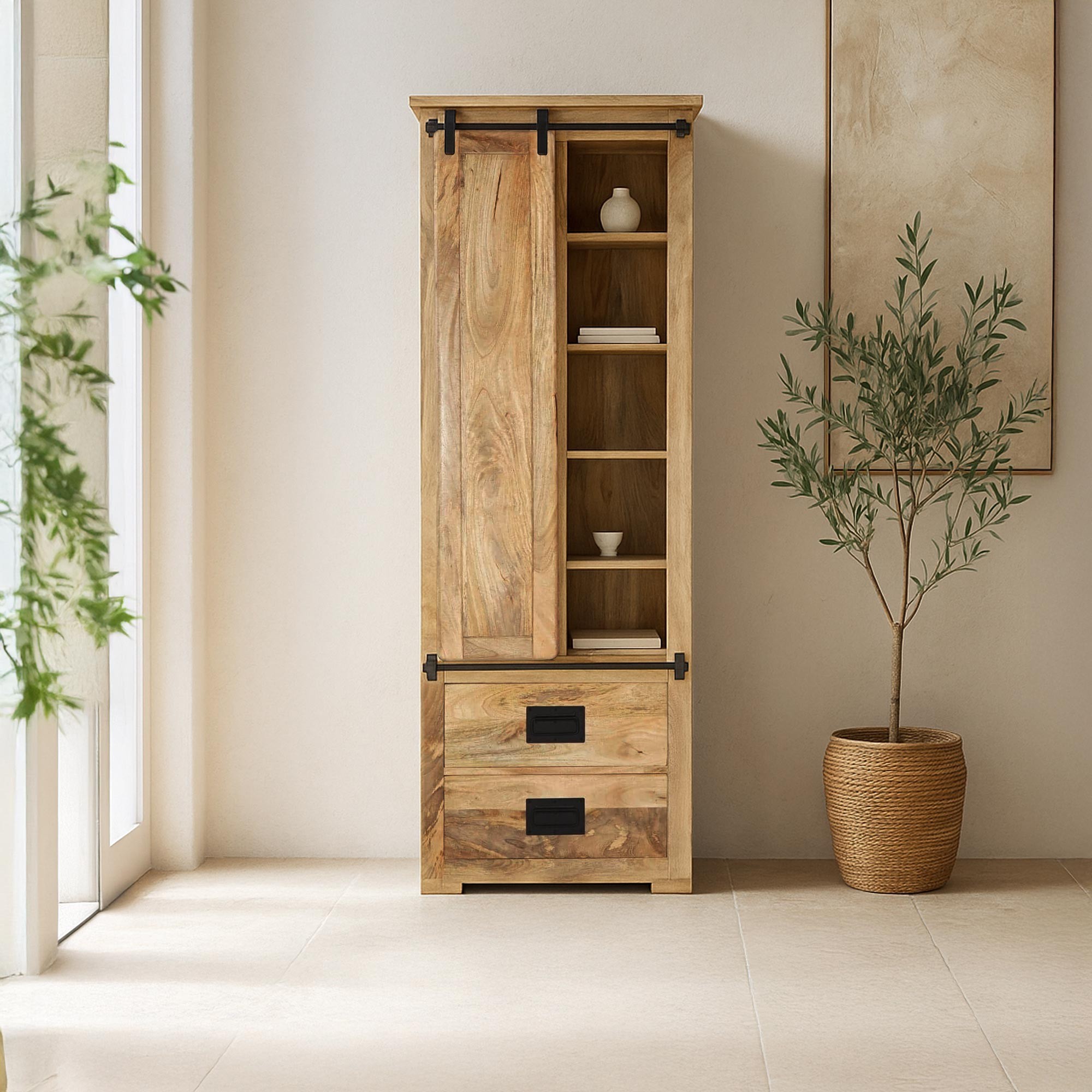 Fabriquée à la main en bois massif de manguier, cette bibliothèque industrielle en bois massif met en valeur la beauté naturelle des veines du bois et la chaleur de sa teinte dorée. Chaque planche a été sélectionnée avec soin pour composer un ensemble homogène, dont le relief subtil apporte texture et profondeur à l’ensemble. Nous avons choisi d’y intégrer une porte coulissante montée sur un rail en métal noir, clin d’œil aux systèmes de grange traditionnels, pour faciliter l’accès aux compartiments tout en affirmant son style.