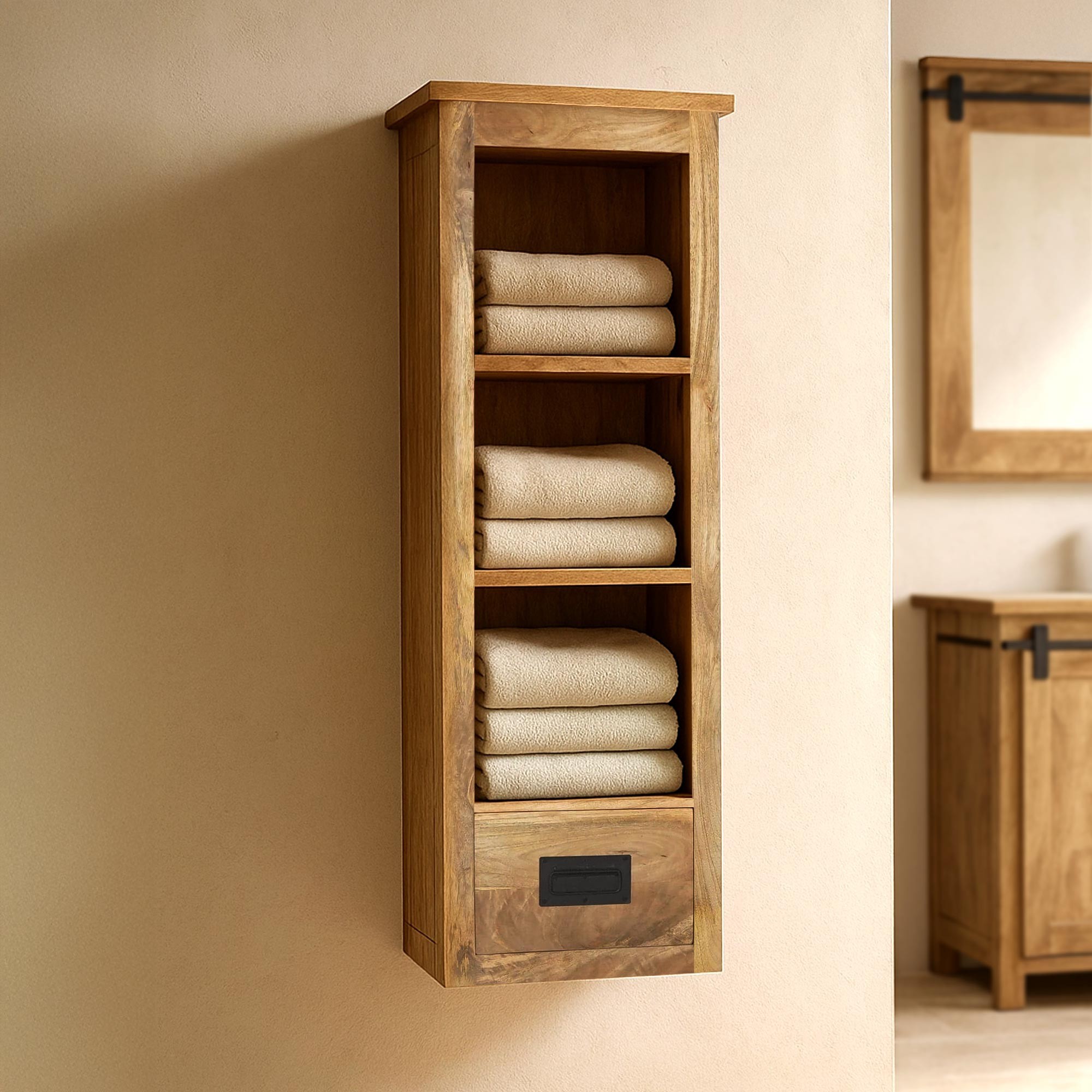 Conçue dans un esprit à la fois pratique et esthétique, cette colonne de salle de bain en bois massif de manguier et métal noir s’inscrit dans la continuité de notre collection Paris, où chaque détail vise à allier authenticité et fonctionnalité. Cette colonne de salle de bain suspendue offre une solution de rangement verticale pensée pour optimiser les espaces, même les plus restreints, tout en apportant une touche chaleureuse et naturelle à votre intérieur.