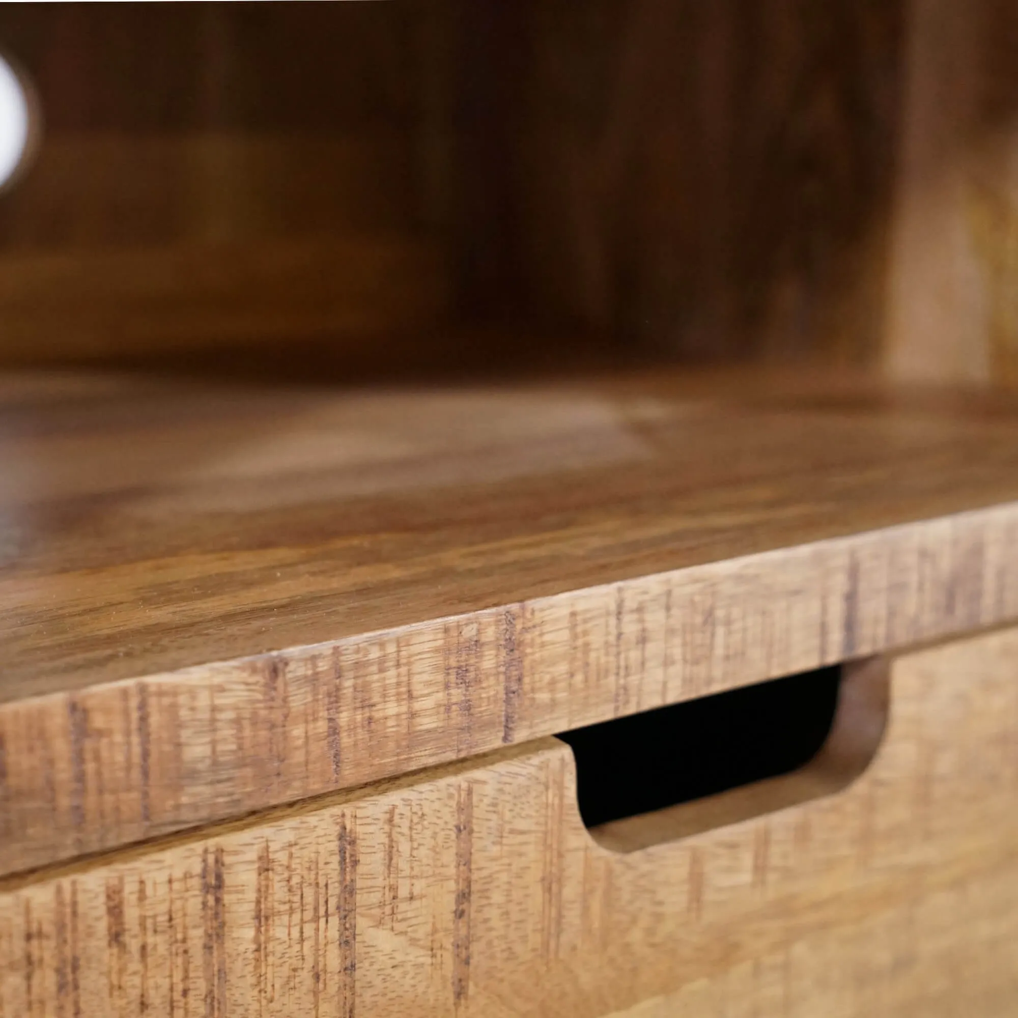 Pensé pour accompagner le quotidien, le meuble TV en bois massif manguier et porte en métal Kansas offre une organisation fluide et intuitive. Les deux niches centrales accueillent facilement vos appareils multimédias ; leur hauteur d’environ 17 cm et leur profondeur de 40 cm permettent d’y glisser box, consoles ou lecteurs sans contrainte. À l’arrière, des ouvertures soignées facilitent le passage des câbles et gardent l’ensemble discret et ordonné. Juste en dessous, deux tiroirs en manguier – de 48,5 cm de largeur – offrent un rangement complémentaire pour les accessoires que l’on préfère garder à portée de main.