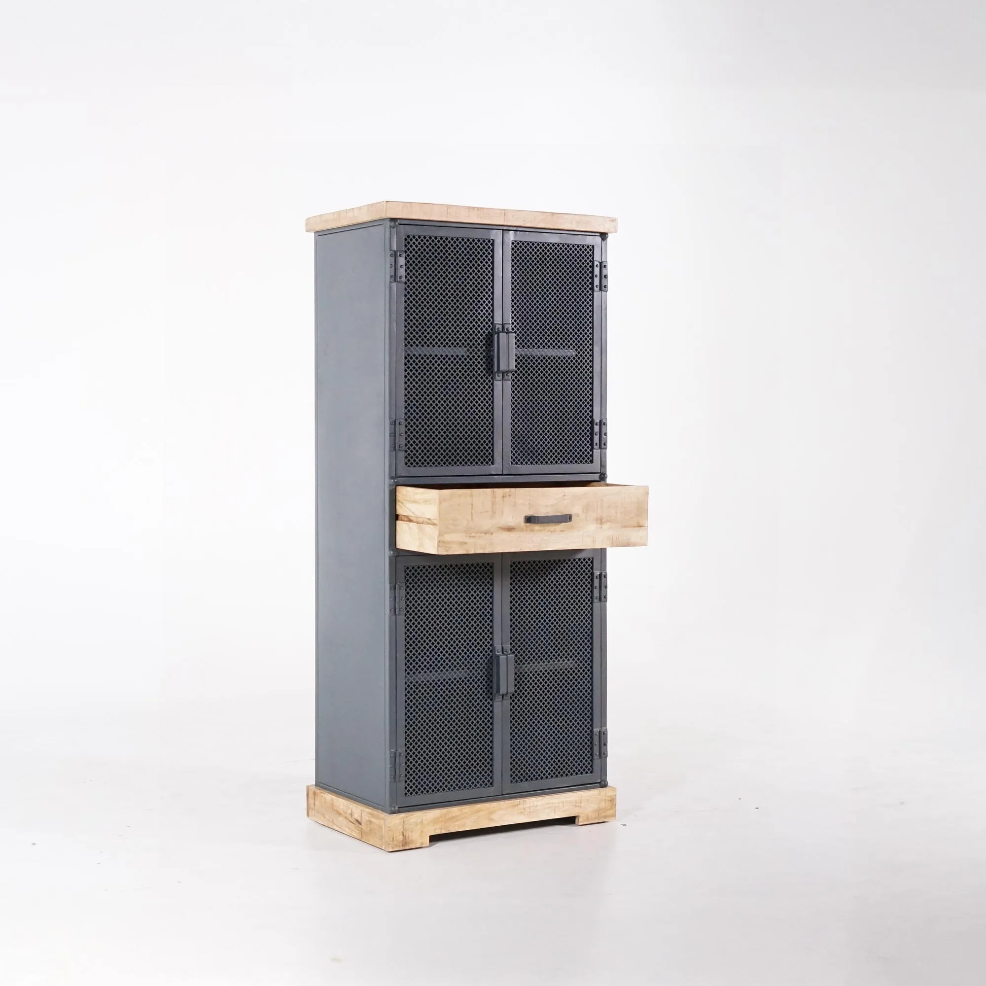 Nous avons choisi d’adoucir le contraste entre la structure métallique et les surfaces en manguier massif qui constituent cette armoire de rangement en métal et bois par des finitions sobres et précises. Les poignées en métal riveté, la base en bois brut et les angles subtilement arrondis traduisent notre exigence de qualité et de cohérence esthétique. Chaque détail vise à rendre ce meuble fonctionnel, robuste et intemporel.