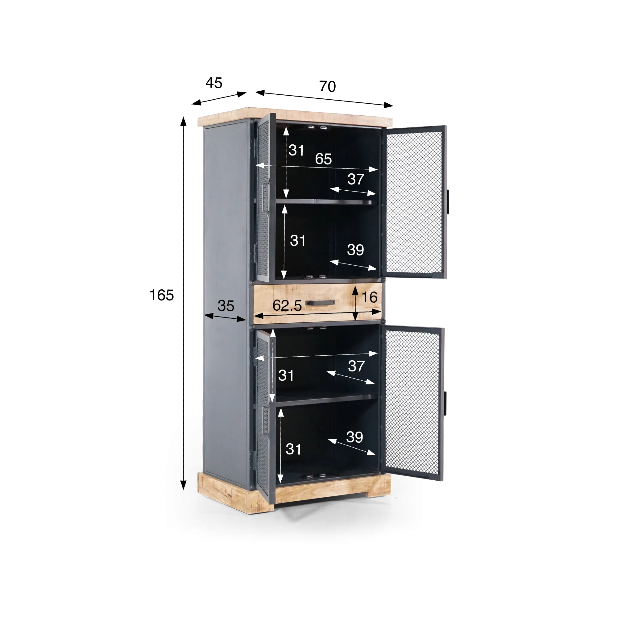 À l’intérieur de cette armoire de rangement en métal et bois, quatre compartiments bien proportionnés offrent un rangement généreux : chaque niche mesure 31 cm de hauteur pour 37 à 39 cm de profondeur selon les étages, permettant d’organiser livres, vaisselle ou accessoires du quotidien. Le tiroir central, large de 62,5 cm et haut de 16 cm, vient compléter cet agencement pratique, idéal pour les objets que l’on souhaite garder à portée de main.
