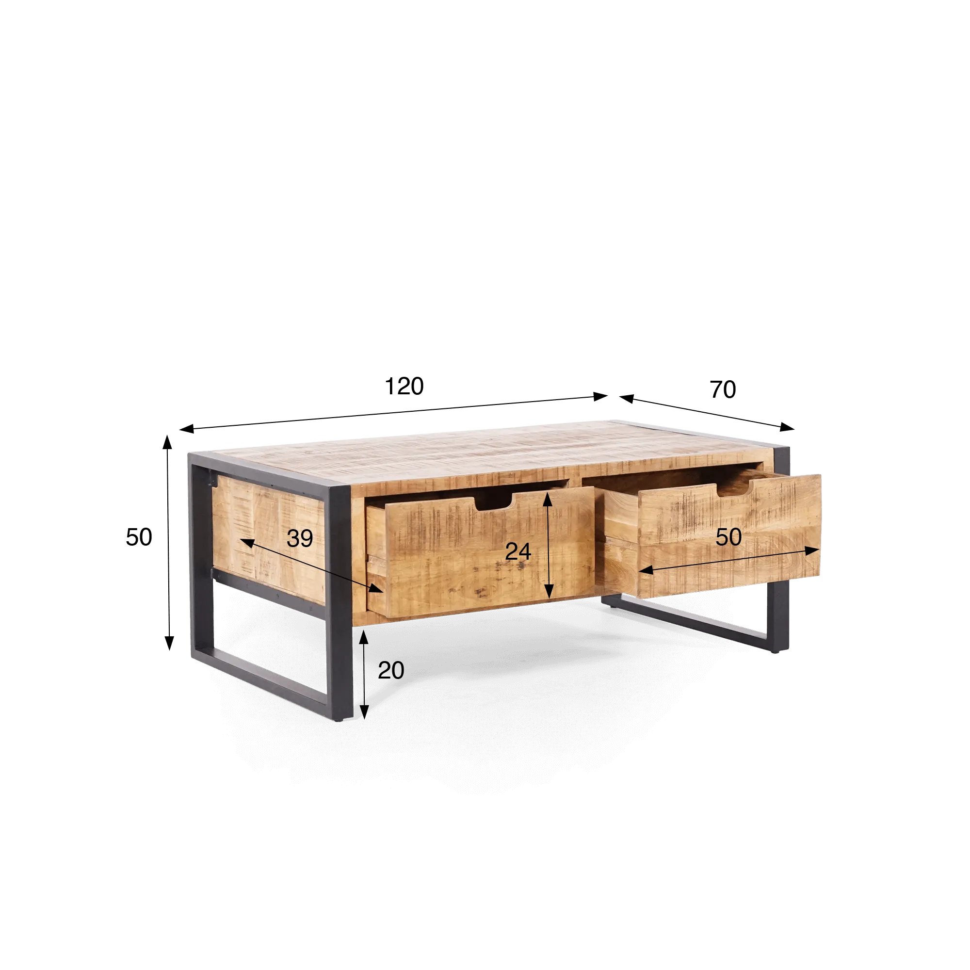La table de salon en bois massif de manguier Kansas offre une surface de 120 × 70 cm, confortable pour les moments partagés comme pour accueillir vos objets du quotidien. Sous le plateau, nous avons intégré deux tiroirs spacieux pour que tout reste à portée de main : ils mesurent chacun 39 cm de profondeur et 24 cm de hauteur, vous permettant d’y glisser magazines, plaids légers, accessoires ou télécommandes. Leur ouverture par encoche, sans poignée, participe à la simplicité du design tout en garantissant une prise en main intuitive.