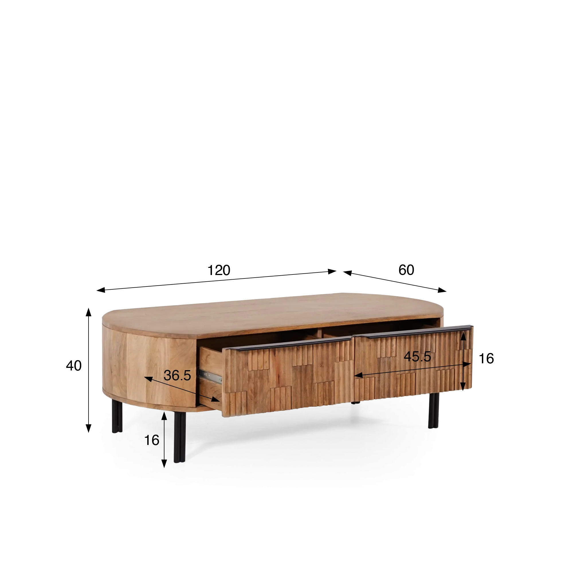 Avec ses 120 cm de long, 60 cm de large et 40 cm de haut, notre table basse en bois de manguier massif Uma offre un format généreux tout en conservant une silhouette légère. Ses bords arrondis et ses lignes douces créent une atmosphère apaisante, idéale pour les intérieurs lumineux et épurés. Nous avons voulu que cette table se distingue par la finesse de son design mais aussi par la richesse de ses détails : les façades de tiroirs présentent un travail artisanal sur le relief du bois, formant un motif géométrique subtil qui capte la lumière et anime la surface sans la surcharger.