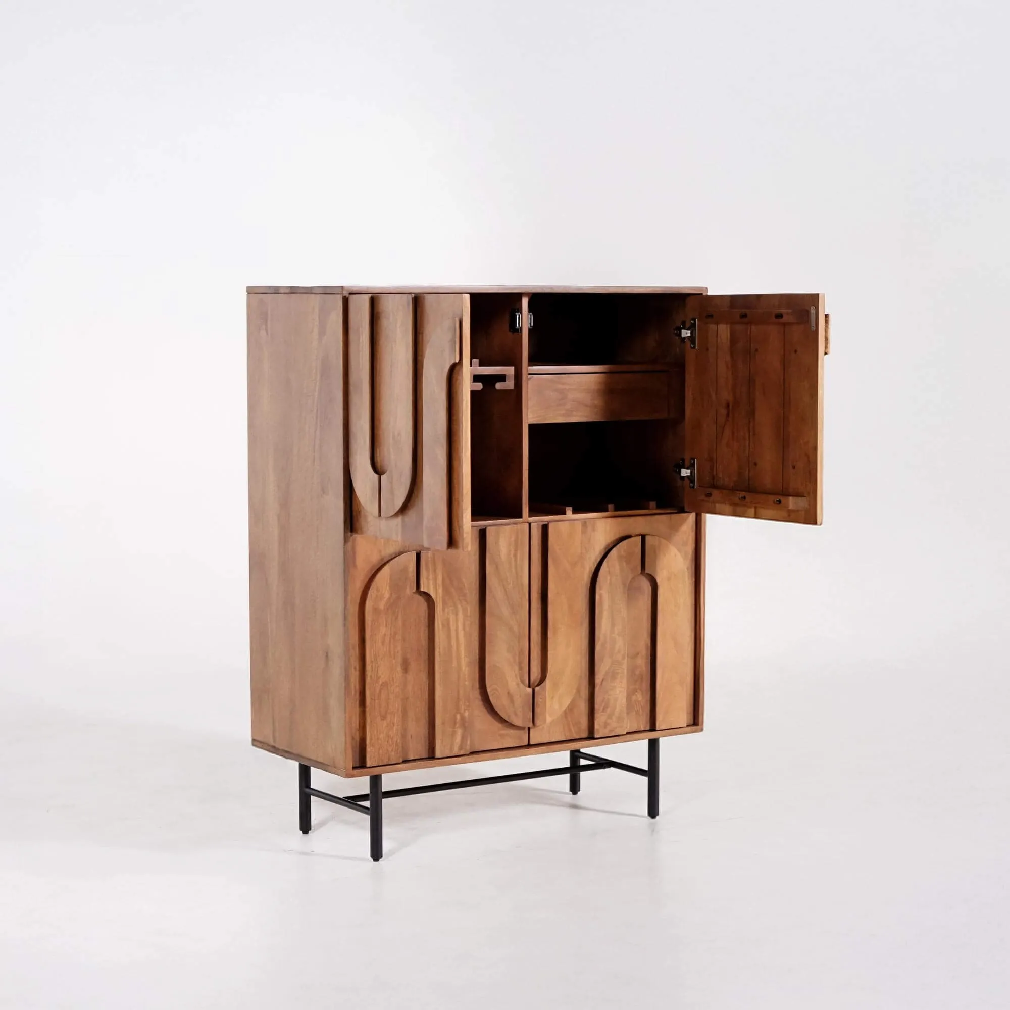 Fabriqué en bois massif de manguier, chaque panneau est soigneusement façonné, révélant un veinage riche et profond, mis en valeur par une finition satinée qui souligne la chaleur naturelle du matériau. Le bois de manguier, reconnu pour sa densité et sa durabilité, confère à ce meuble bar en bois massif une solidité remarquable tout en conservant une douceur au toucher. L’ensemble repose sur une structure en métal noir sobre et fine, qui élève la pièce et apporte une touche contemporaine à son allure chaleureuse.