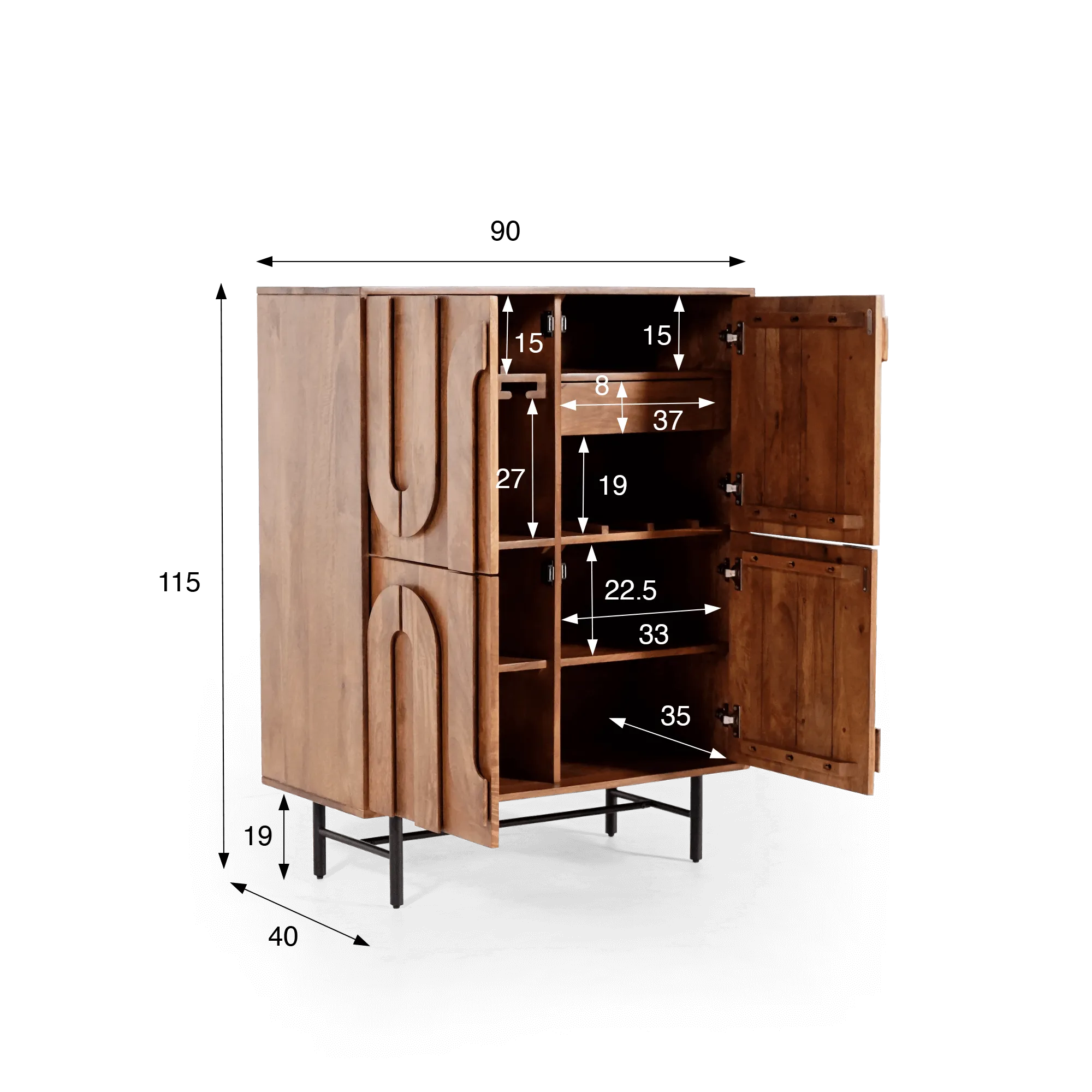 Avec ses dimensions de 90 cm de large, 45 cm de profondeur et 116 cm de haut, ce meuble bar en bois massif trouve naturellement sa place dans un salon ou une salle à manger, où il devient immédiatement un point focal. Son piètement métallique de 19 cm de hauteur allège visuellement la structure tout en assurant une parfaite stabilité.