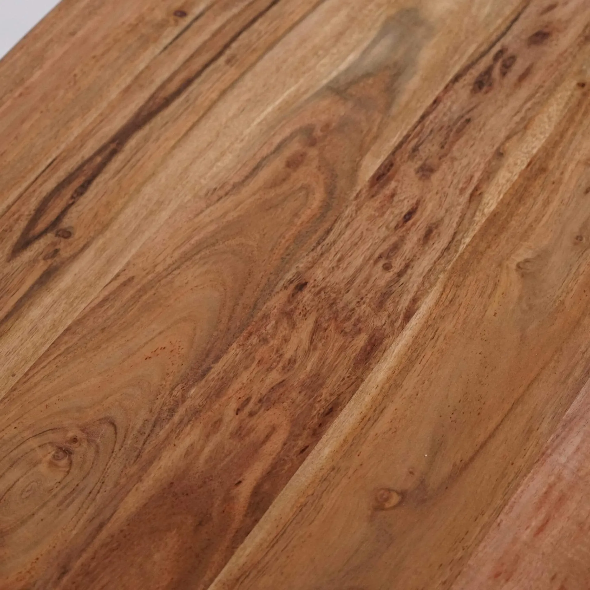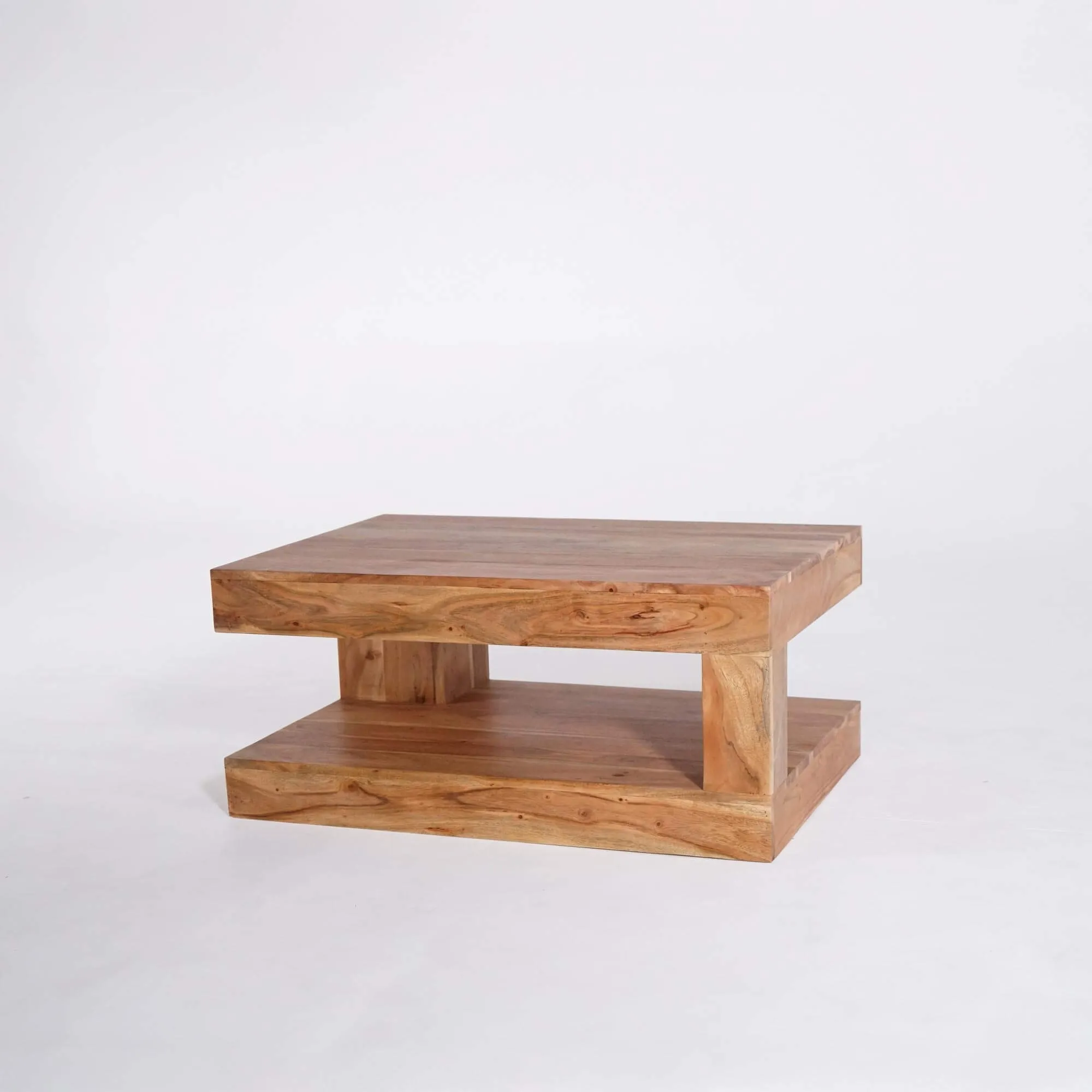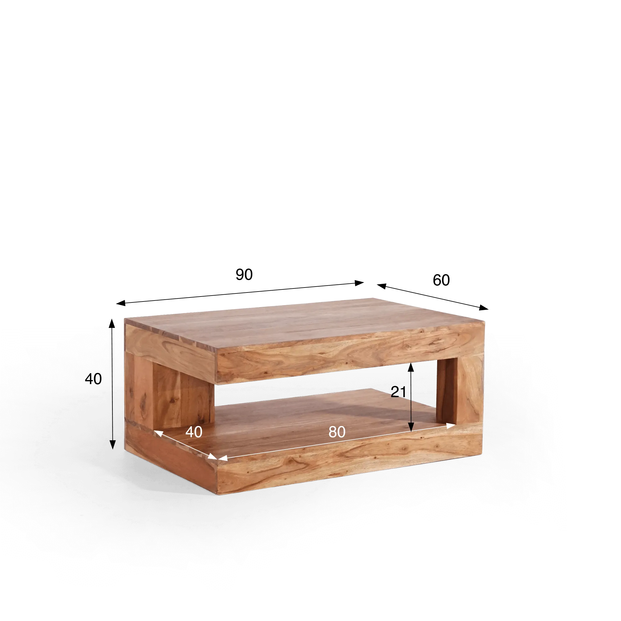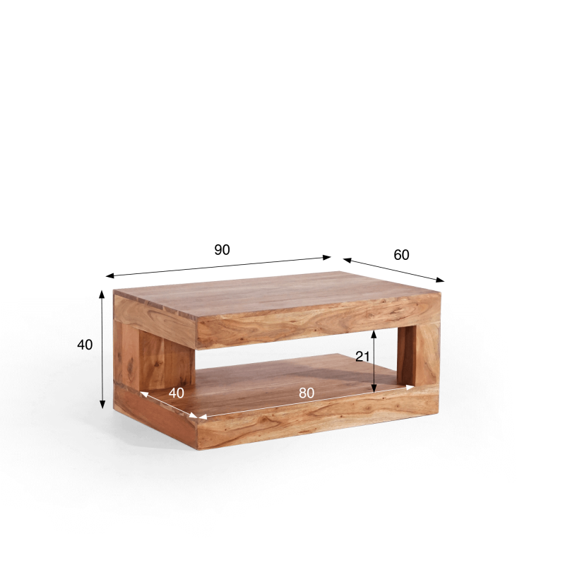 À travers ce design volontairement épuré, nous voulions créer une table basse rectangulaire en bois massif d'acacia qui trouve immédiatement sa place dans un intérieur lumineux, un salon convivial ou un espace plus minimaliste. Le plateau de 90 cm par 60 cm offre une surface généreuse sans dominer la pièce, tandis que la base forme une étagère ouverte de 80 cm de largeur, idéale pour glisser quelques livres ou garder à portée de main les objets du quotidien. La hauteur de 40 cm a été pensée pour accompagner naturellement la ligne d’un canapé, créant une circulation fluide et une zone de vie agréable.