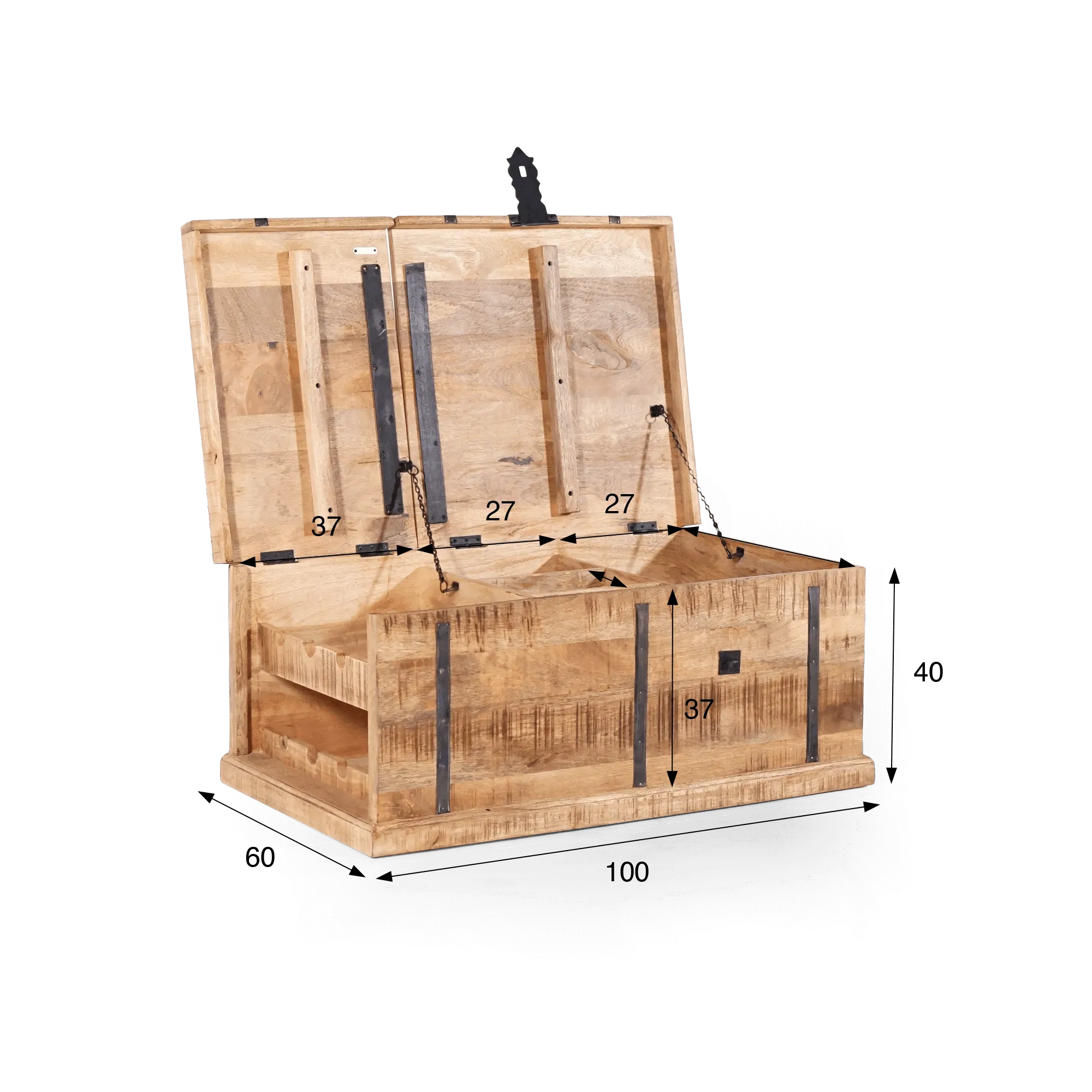 Nous avons imaginé cette table de salon coffre de rangement en bois massif comme un meuble capable de transformer l’atmosphère d’un salon tout en répondant à un véritable besoin du quotidien. Travaillée en bois massif d'acacia, elle dévoile un bois chaleureux aux nuances dorées, parcouru de veines irrégulières que la lumière souligne avec douceur. Dès le premier regard, on perçoit la présence affirmée de la pièce : son allure évoque les malles d’autrefois, revisitées dans une vision plus contemporaine et naturelle.
