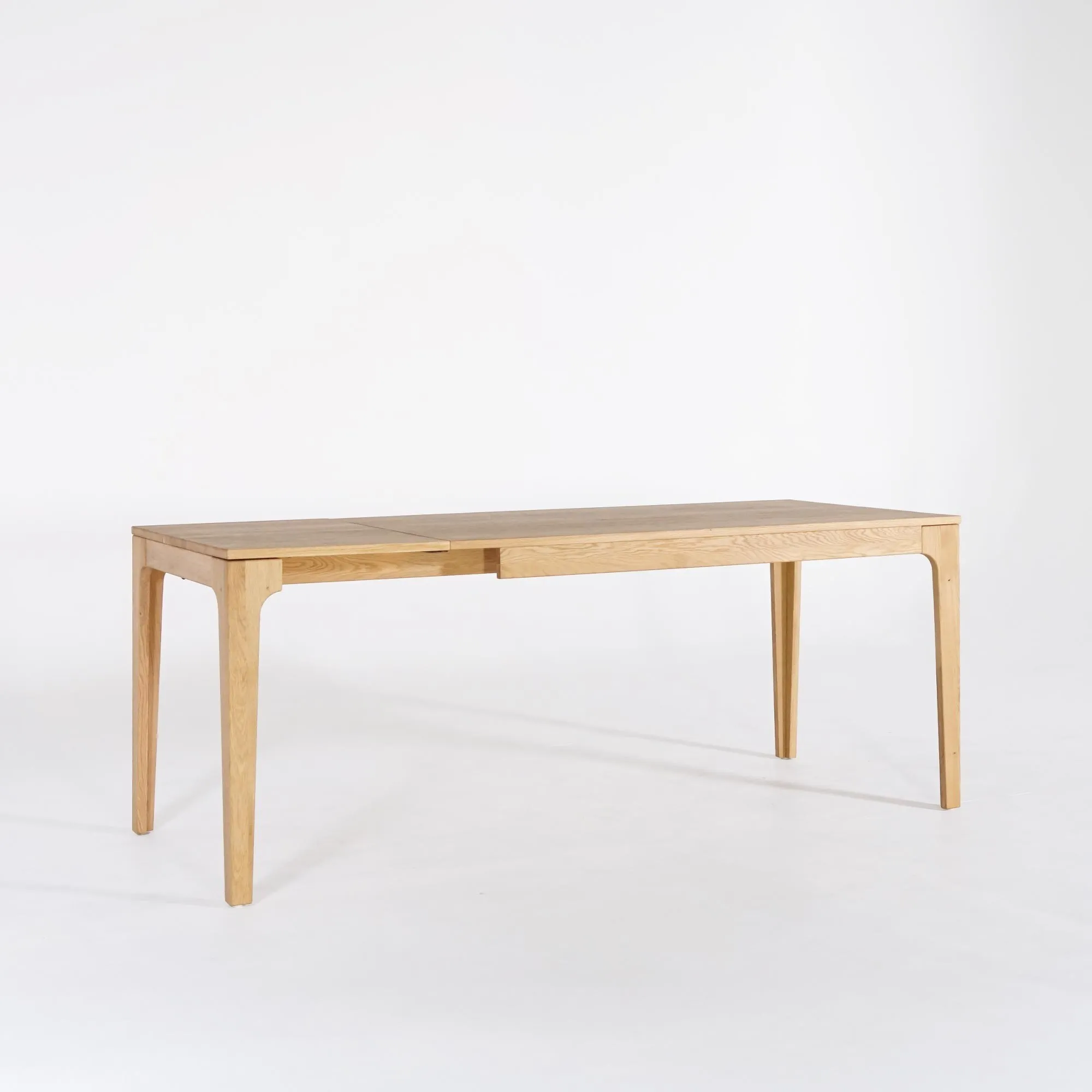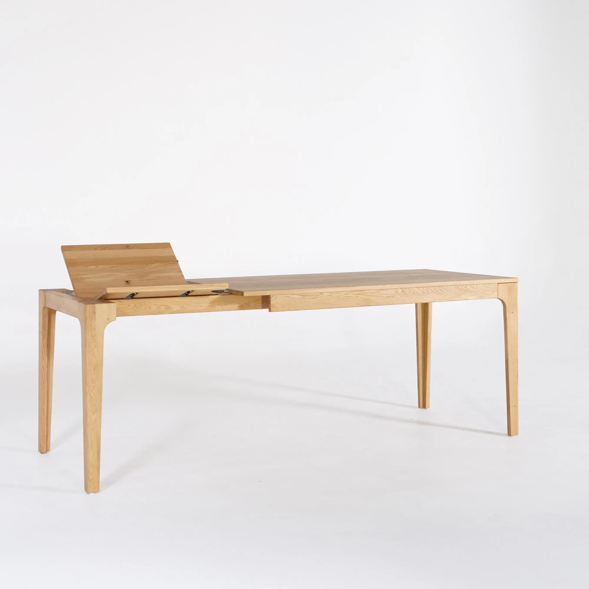 Le plateau en chêne massif révèle un veinage vivant, ponctué de nuances naturelles qui accrochent la lumière au fil de la journée. Le format de 140 x 80 cm de cette table à manger rectangulaire en bois de chêne offre un équilibre idéal pour les repas du quotidien, tout en conservant une présence affirmée dans la pièce. L’allonge intégrée de 50 cm prolonge la table avec fluidité, portant sa longueur totale à 190 cm lorsque l’espace ou les invités le demandent. Le système d’extension a été pensé pour rester discret, sans rompre la continuité visuelle du plateau une fois refermé.