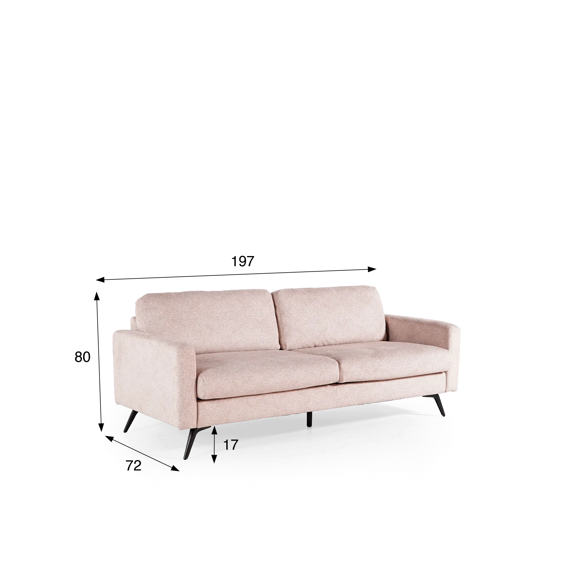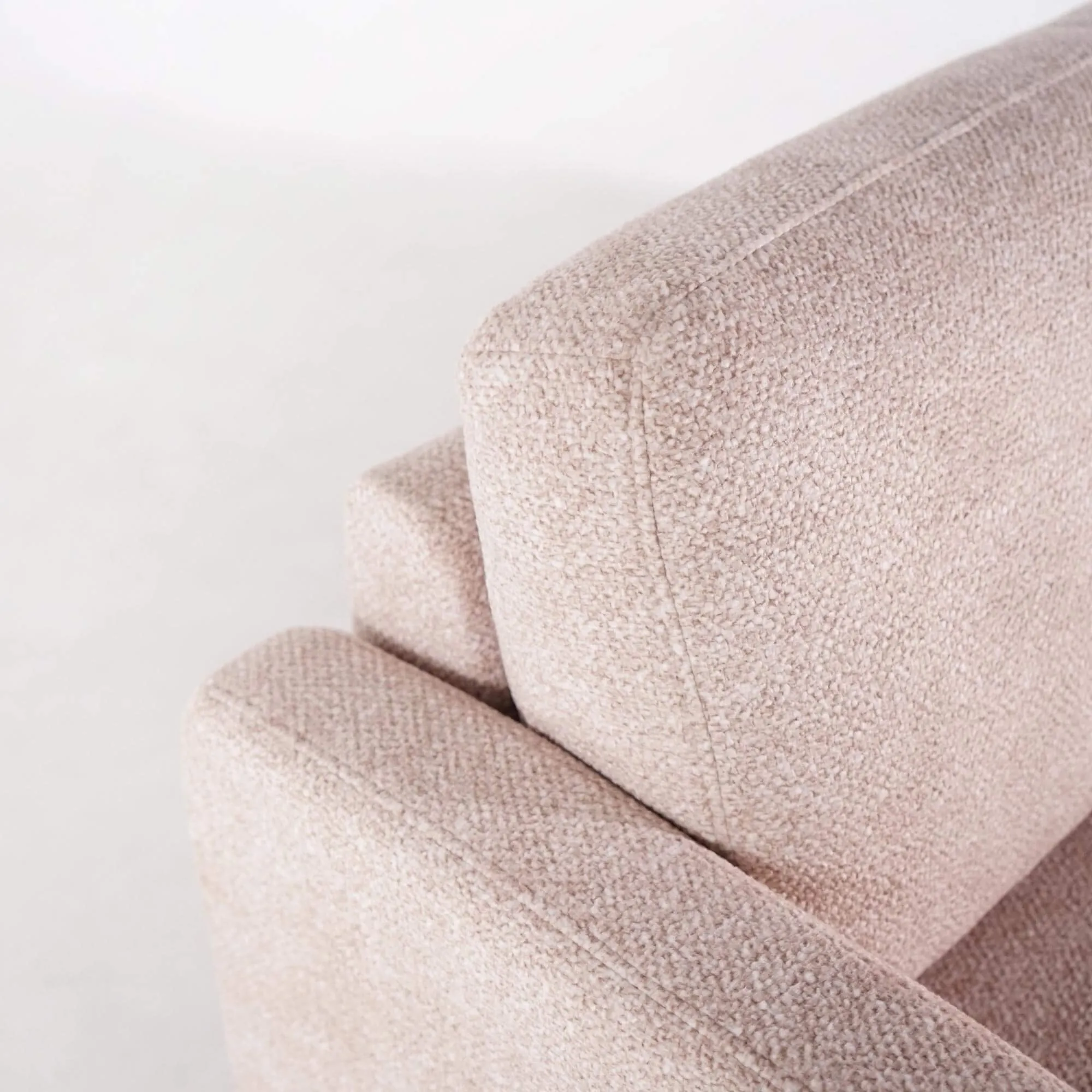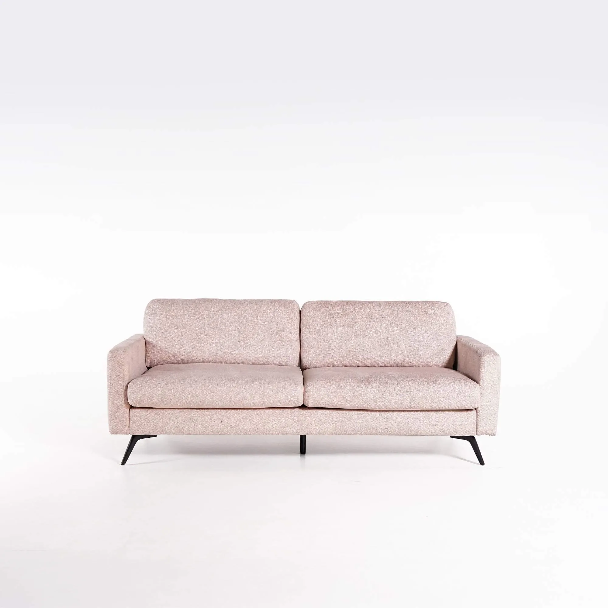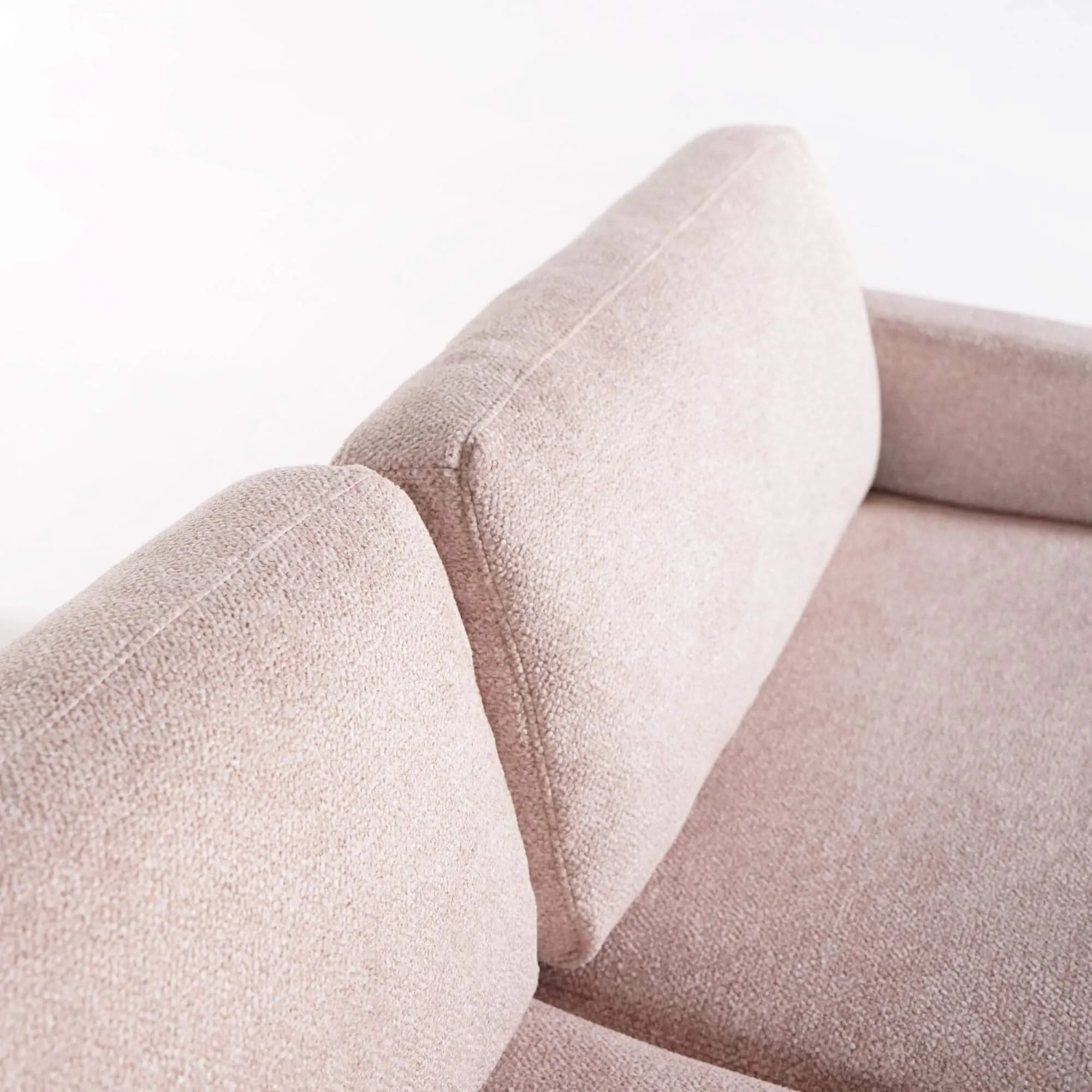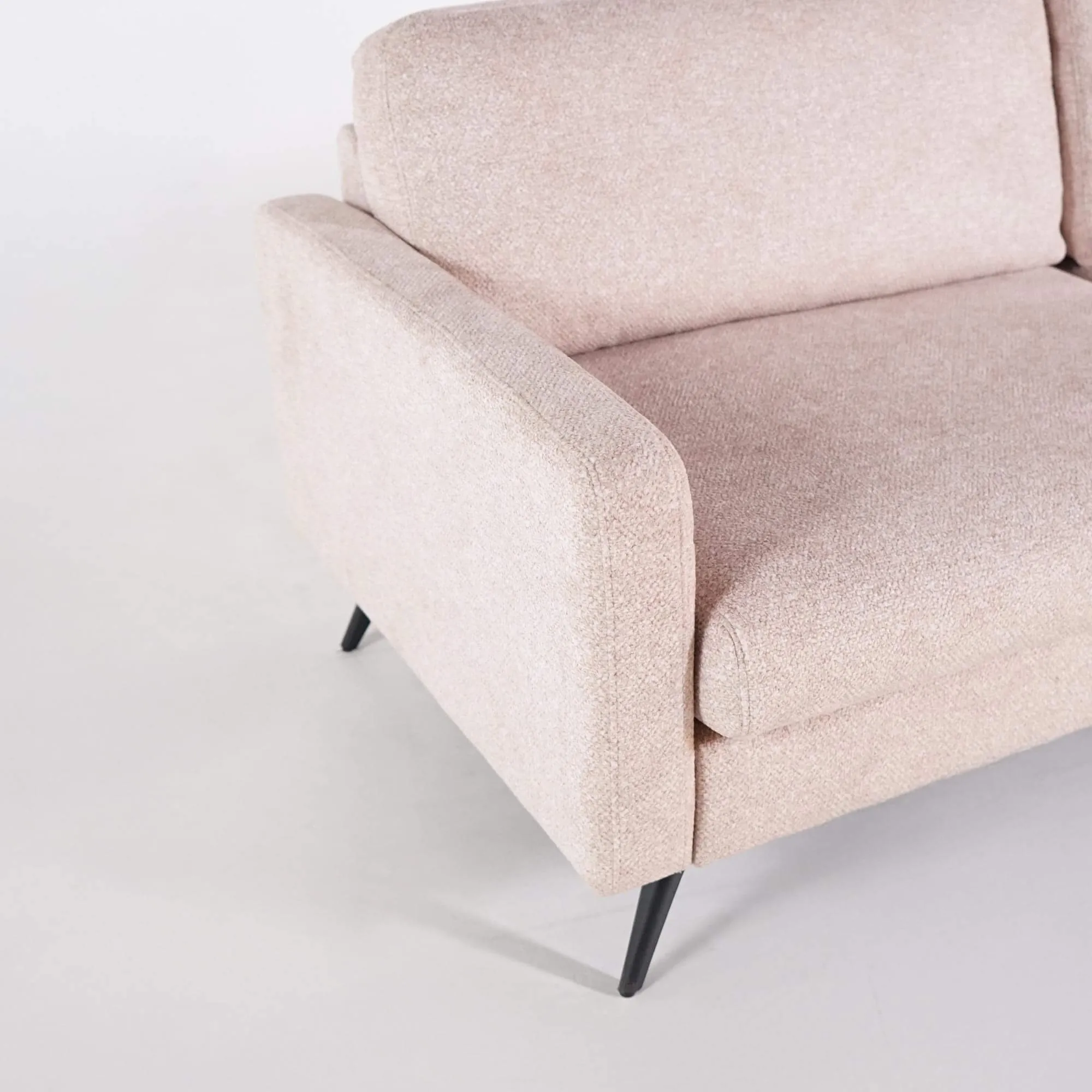 La structure du canapé design 3 places Siena repose sur des pieds en métal noir au design élancé, contrastant subtilement avec la teinte sable du tissu. Leur forme légèrement inclinée confère à l’ensemble une allure aérienne, tout en assurant une excellente stabilité. Le garnissage de haute qualité, réalisé de manière artisanale, offre une assise moelleuse et un maintien agréable, idéal pour de longs moments de détente.