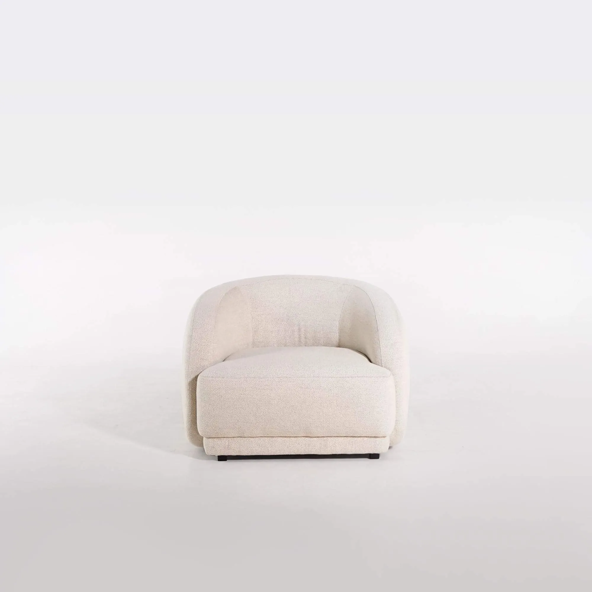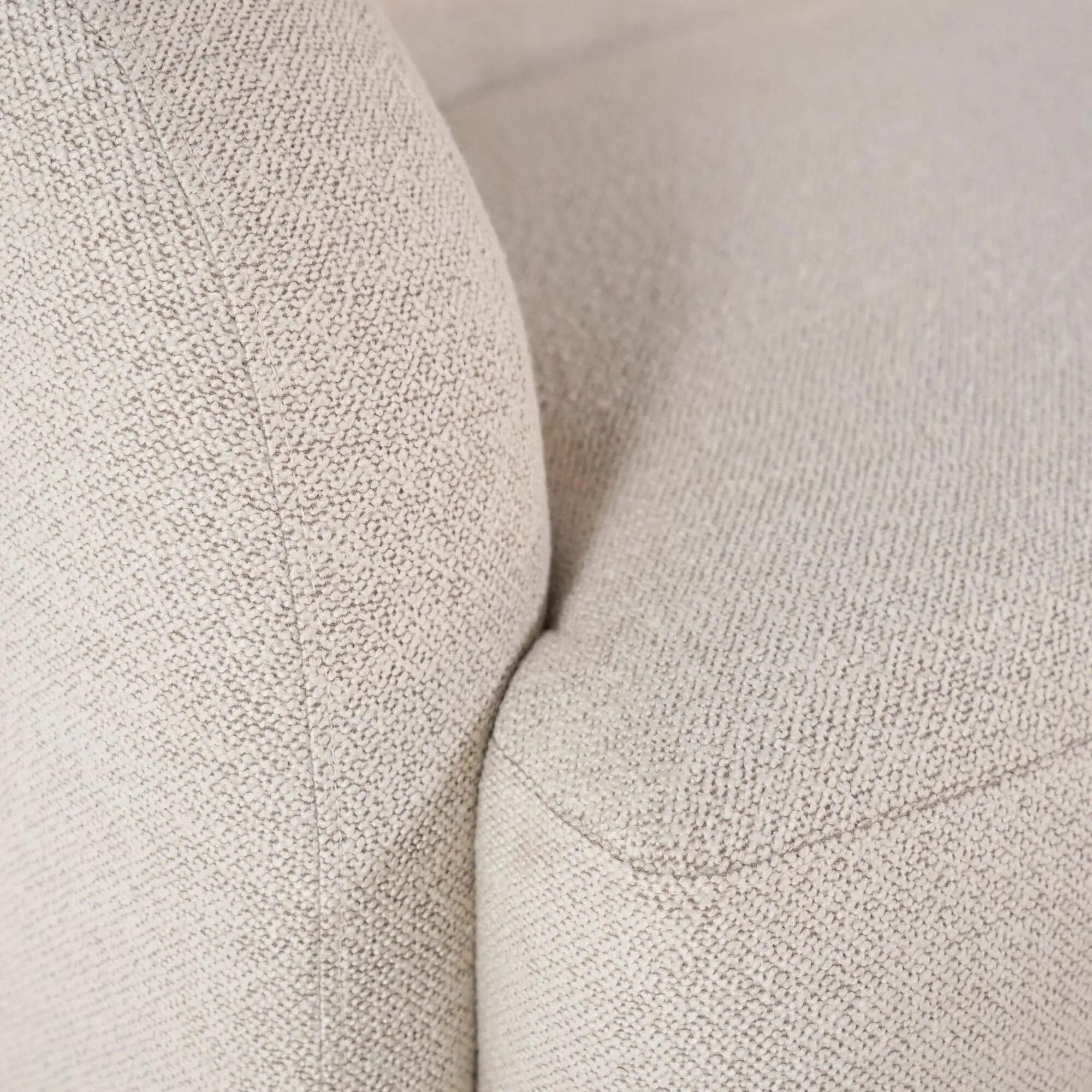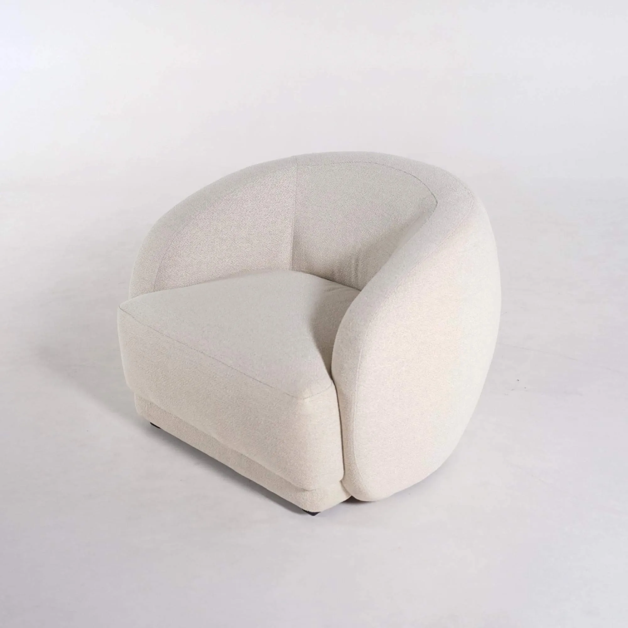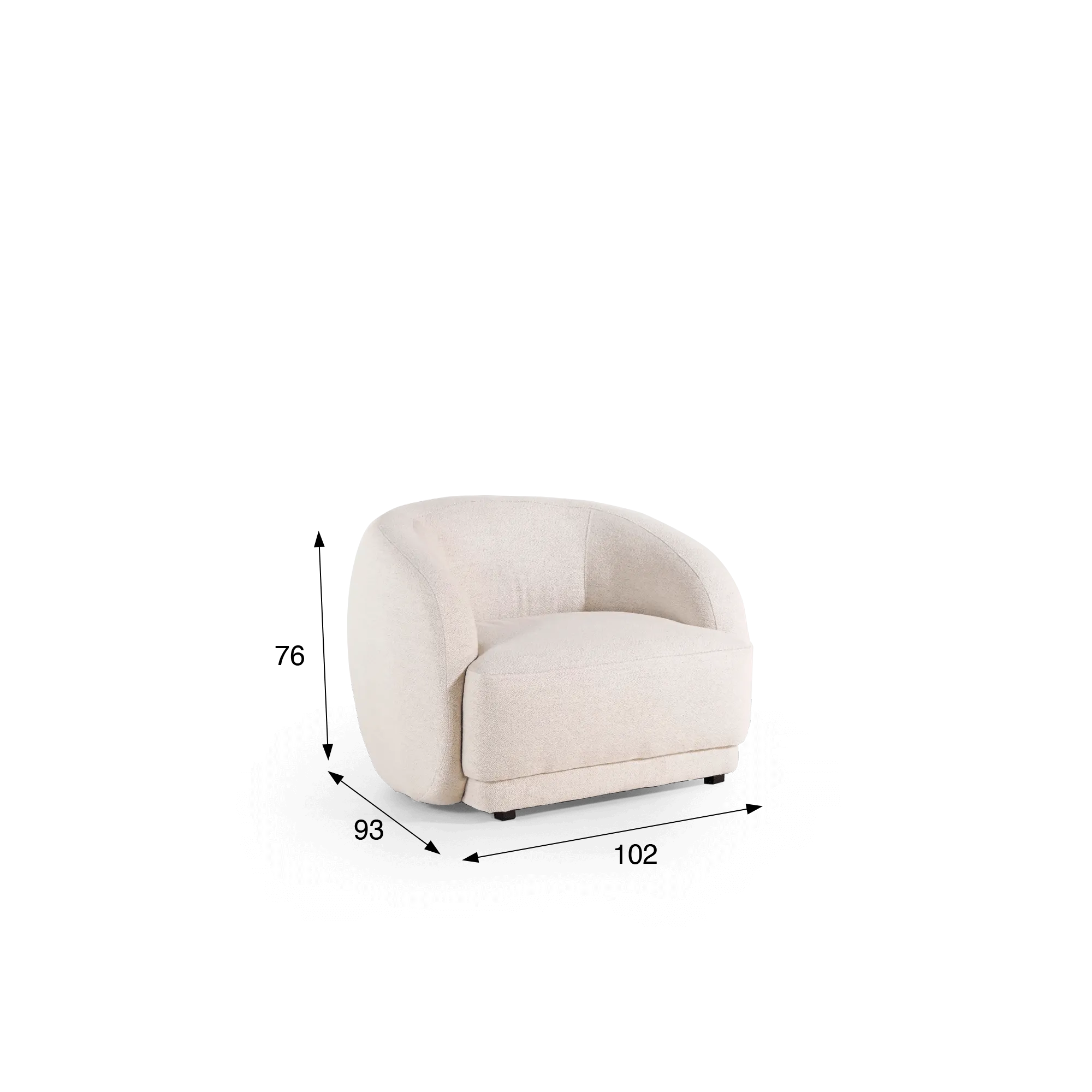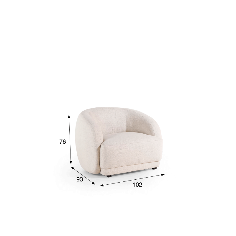 Nous avons choisi un tissu bouclé texturé, certifié Oeko-Tex®, qui combine résistance et toucher agréable. Sa teinte claire et lumineuse met en valeur la rondeur du fauteuil et facilite son intégration dans des intérieurs minimalistes comme dans des ambiances plus chaleureuses. Les pieds discrets en plastique noir assurent stabilité et légèreté visuelle, tout en laissant ce fauteuil en tissu exprimer pleinement sa silhouette généreuse.
